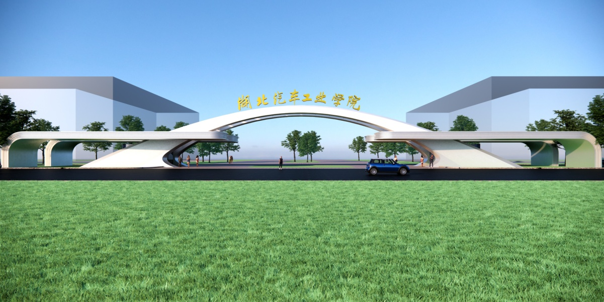 本大门方案设计的造型以”汽车”为原型,通过抽象变形后,大门整体意象有二,其一以汽车侧面造型为原型,该意向“突出地表达了学校鲜明的学科特色、办学特色;代表了学校围绕汽车产业链,致力于培养汽车行业卓越工程师的远大理想和宏伟目标。其二如李白诗句中的两岸夹明镜,双桥落彩虹,宛如两山之间架起的拱桥,两者合在一起的寓意为英国上市公司365以开放的胸怀,接纳学子,并将为各位学子架起一座通向成功的虹桥。