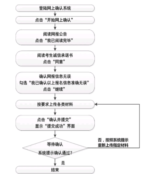 考生在规定时间内,进入登陆页面后,输入学信网账号、密码,核对本人的网报信息、按要求上传相关材料照片后等待考点审核结果,网上审核通过的考生视为报名成功。在审核期内,网上审核未通过的考生可补充相关材料,等待审核,审核通过后视为报名成功。逾期不再办理确认手续。建议考生不要在确认的最后一天提交审核材料,以免因审核不通过没有足够的时间准备补充材料而错过网上确认。