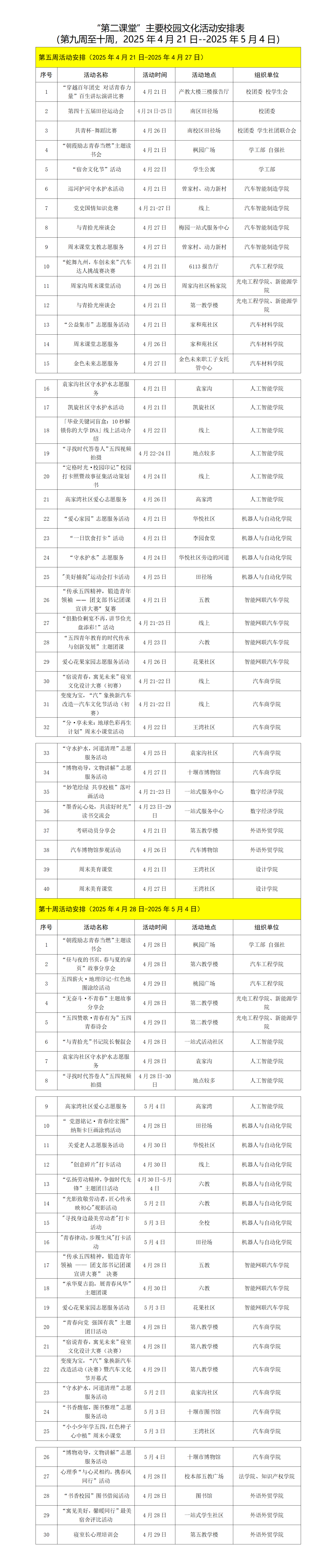 第二课堂”主要校园文化活动安排表(第九周至十周)