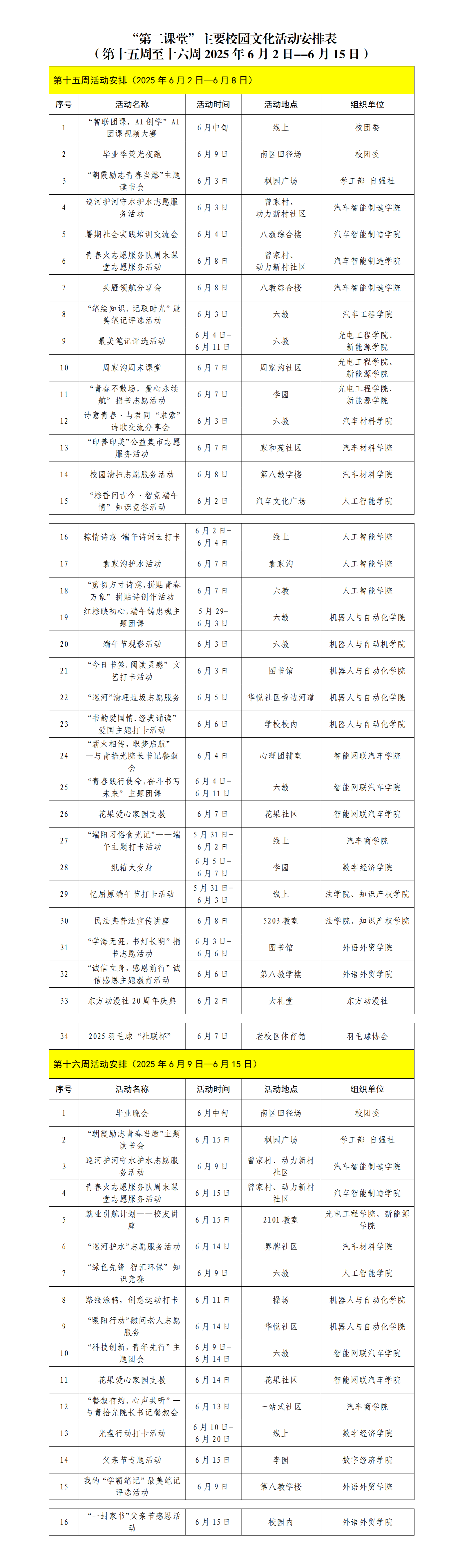 第二课堂”主要校园文化活动安排表(第十五周至十六周)