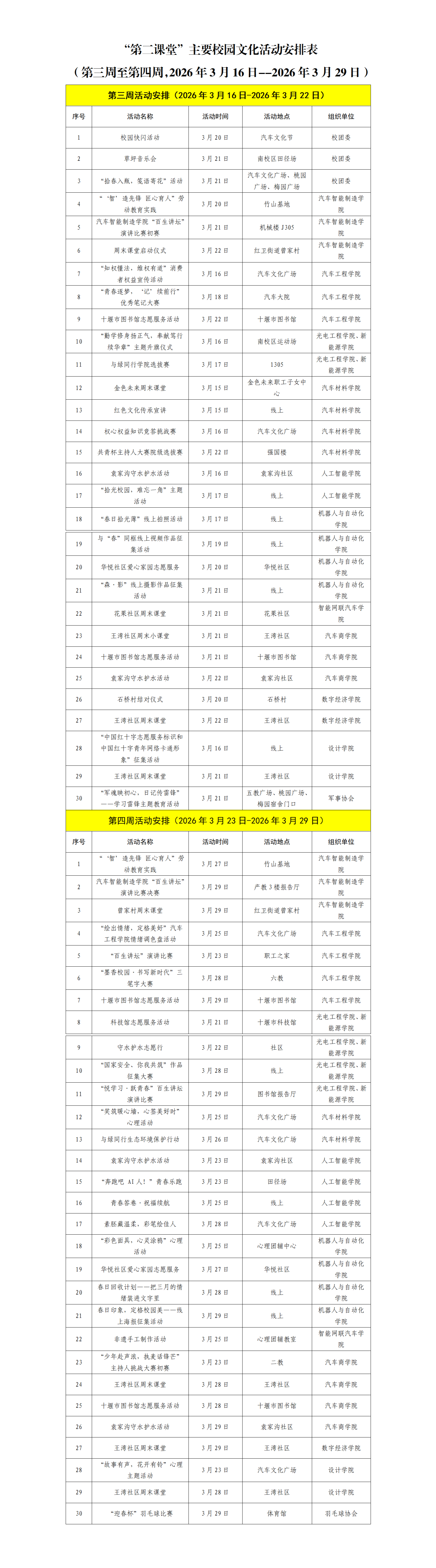“第二课堂”主要校园文化活动安排表(第三周至四周,2026年3月16日--2026年3月29日)