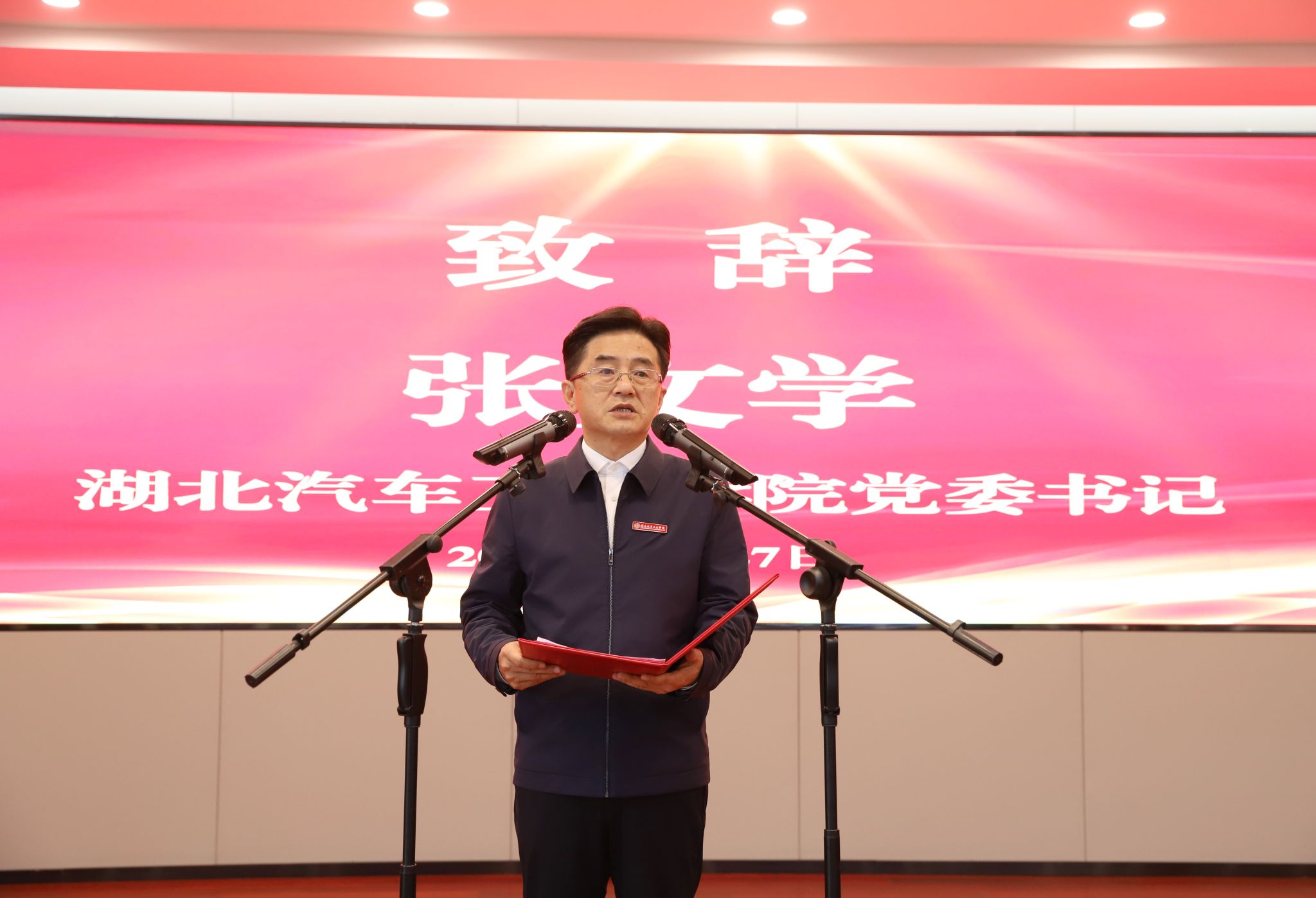 校党委书记张文学代表学校致辞,表示学校诞生于民族汽车工业发轫之时,壮大在中国汽车工业蓬勃发展的伟大征程之中,目前正向着“三步走”发展战略踔厉奋发。学校一直高度重视知识产权学科专业、平台等建设,早在2006年就设立了知识产权科研机构,2015年4月湖北省知识产权培训(十堰)基地建立后,学校知识产权学科得到了长足发展,为区域经济社会培养了大量的知识产权人才。湖北省汽车产业知识产权研究院是汉外高校唯一具有知识产权学科,省属高校中第二家设立知识产权学院的高校。它的成立,为湖北省和十堰市知识产权人才培养、科学研究注入新的动能和活力。