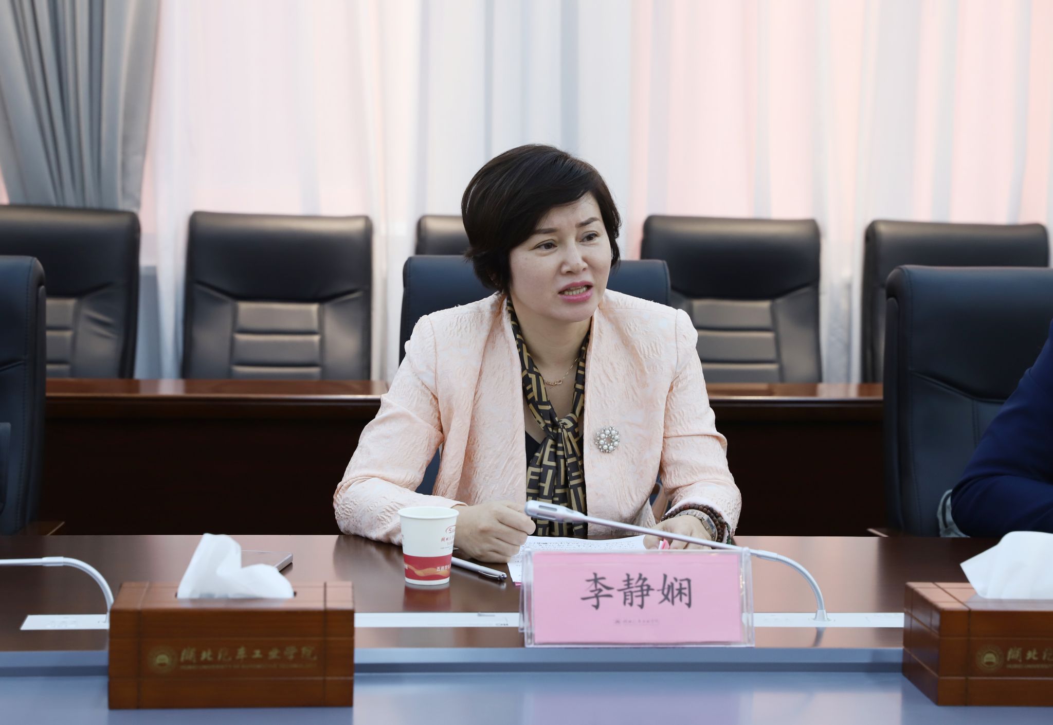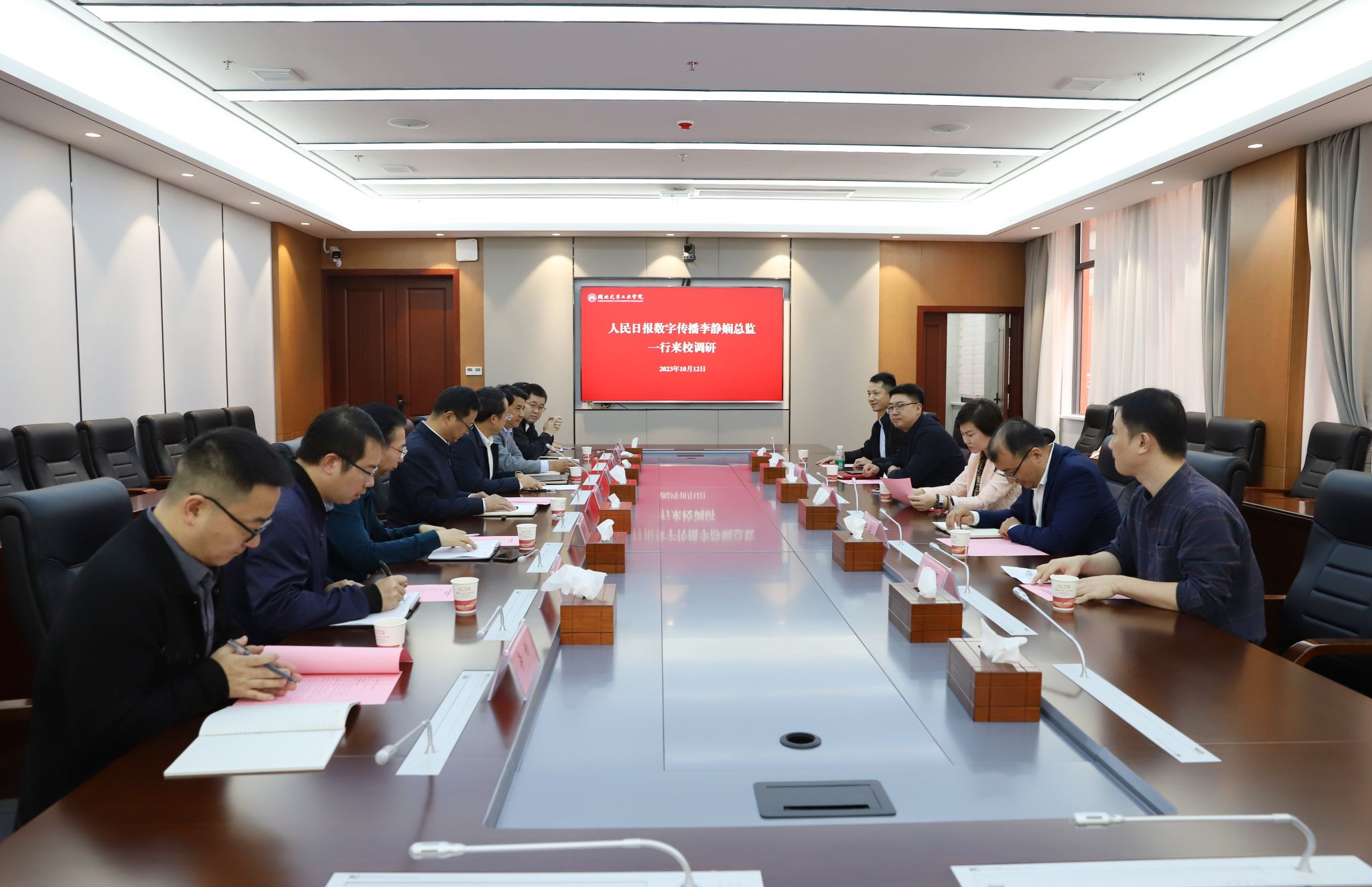 本网讯(文/图 邓玉洁)10月12日下午,人民日报数字传播(湖北)李静娴总监一行来校,在产教大楼三楼会议室开展交流座谈。党委副书记陈建平热情接待,宣传部、图书馆、信息技术中心、马克思主义学院相关人员参加座谈会。