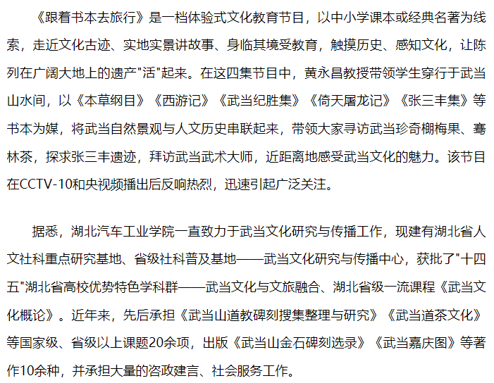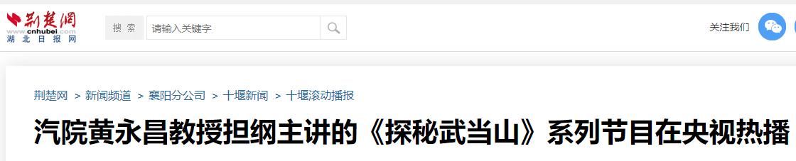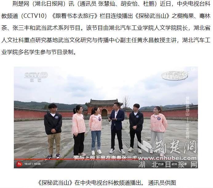 【荆楚网】汽院黄永昌教授担纲主讲的《探秘武当山》系列节目在央视热播