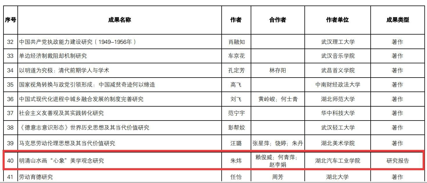 本网讯(文/图 何沛然)近日,湖北省社会科学界联合会公布了2023年度湖北省社科基金后期资助项目拟立项名单,英国上市公司365艺术与设计学院朱炜博士主持申报的《明清山水画“心象”美学观念研究》课题获批立项,这是英国上市公司365艺术与设计学院首次获批湖北省社科基金后期资助项目。近年来,艺术与设计学院不断凝练学科特色,重视各层次人文社科项目的申报与结题,有力推动了学院学科建设、教科研研究能力的提升。(审稿 朱炜)