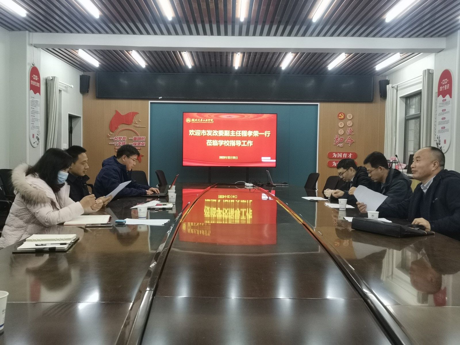 本网讯(文/图 常金星)12月13日,十堰市发展和改革委员会党组成员、副主任程孝荣等一行3人莅临学校调研指导工作。校党委常委、党政办公室主任王文山,以及汽车工程学院、合作发展处等相关单位人员参加会议。