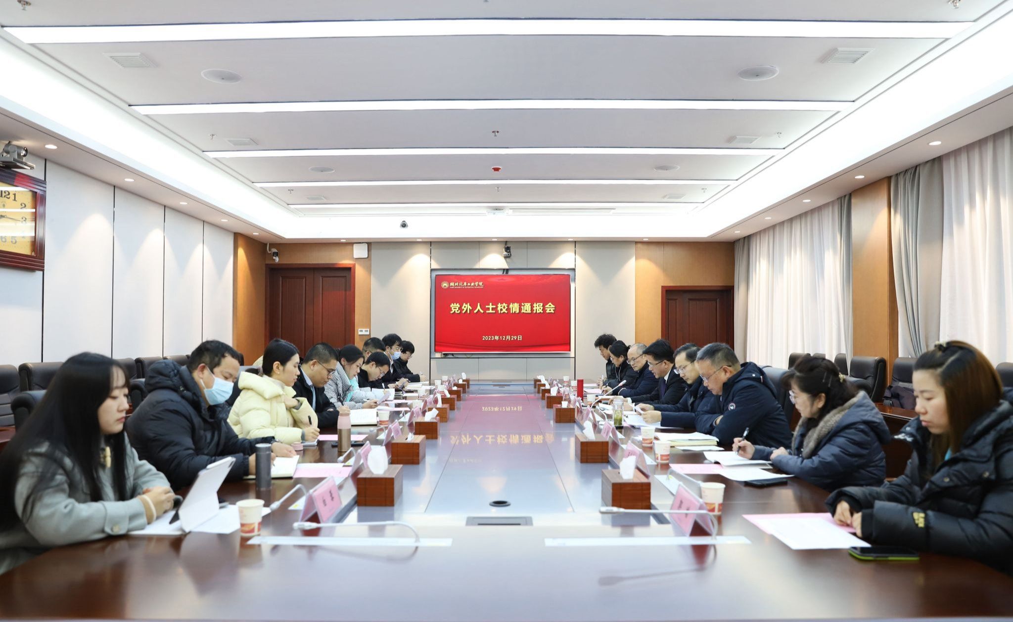 张文学向党外人士通报了学校2023年事业发展情况和高质量跨越式发展所取得的显著成绩。他指出,在全校师生共同努力下,学校完成了扩建校区如期建成启用、孔子学院成功获批揭牌、博士引进首次到岗破百等3项“不可能”完成任务;开创了办学规模实现突破、办学资源实现突破、国字项目成果实现突破、社会认可实现突破等4项历史性突破;实现了凝心铸魂大提升、内涵发展大提升、民生服务大提升、能力作风大提升、力量汇聚大提升等5个方面大提升。他表示,学校2023年发展态势喜人、取得成绩显著,他代表学校党委、行政对党外人士为学校实现“三步走”发展战略作出的积极贡献表示衷心的感谢!