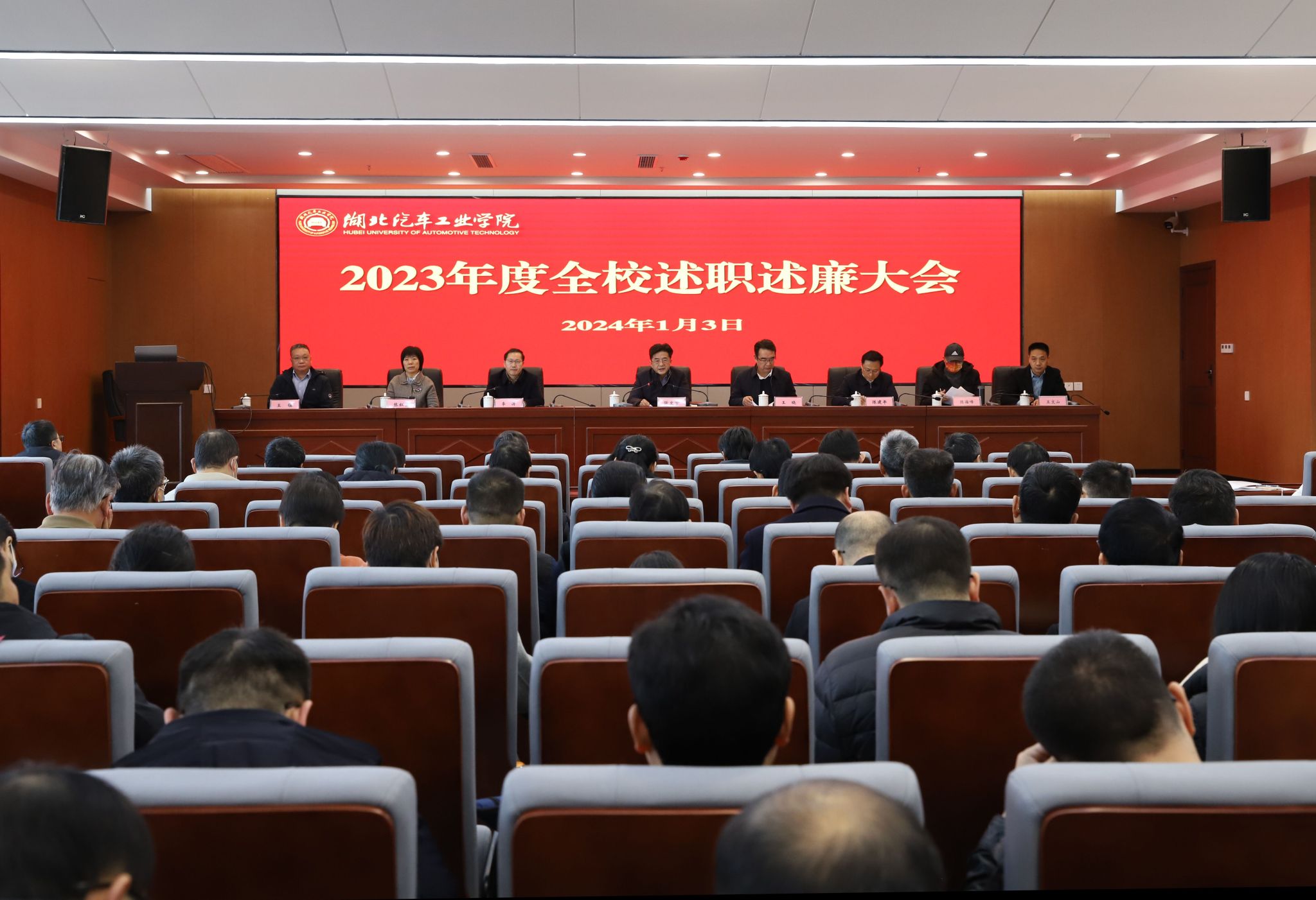 本网讯(文/图 邓玉洁)1月3日上午,2023年度全校述职述廉大会暨二级党组织书记抓党建述职评议会在产教大楼三楼报告厅举行。全体在家校领导、中层干部、“两代表一委员”、民主党派负责人、工会委员会委员代表、教师代表齐聚一堂,总结交流2023年工作。会议由党委副书记李涛主持。