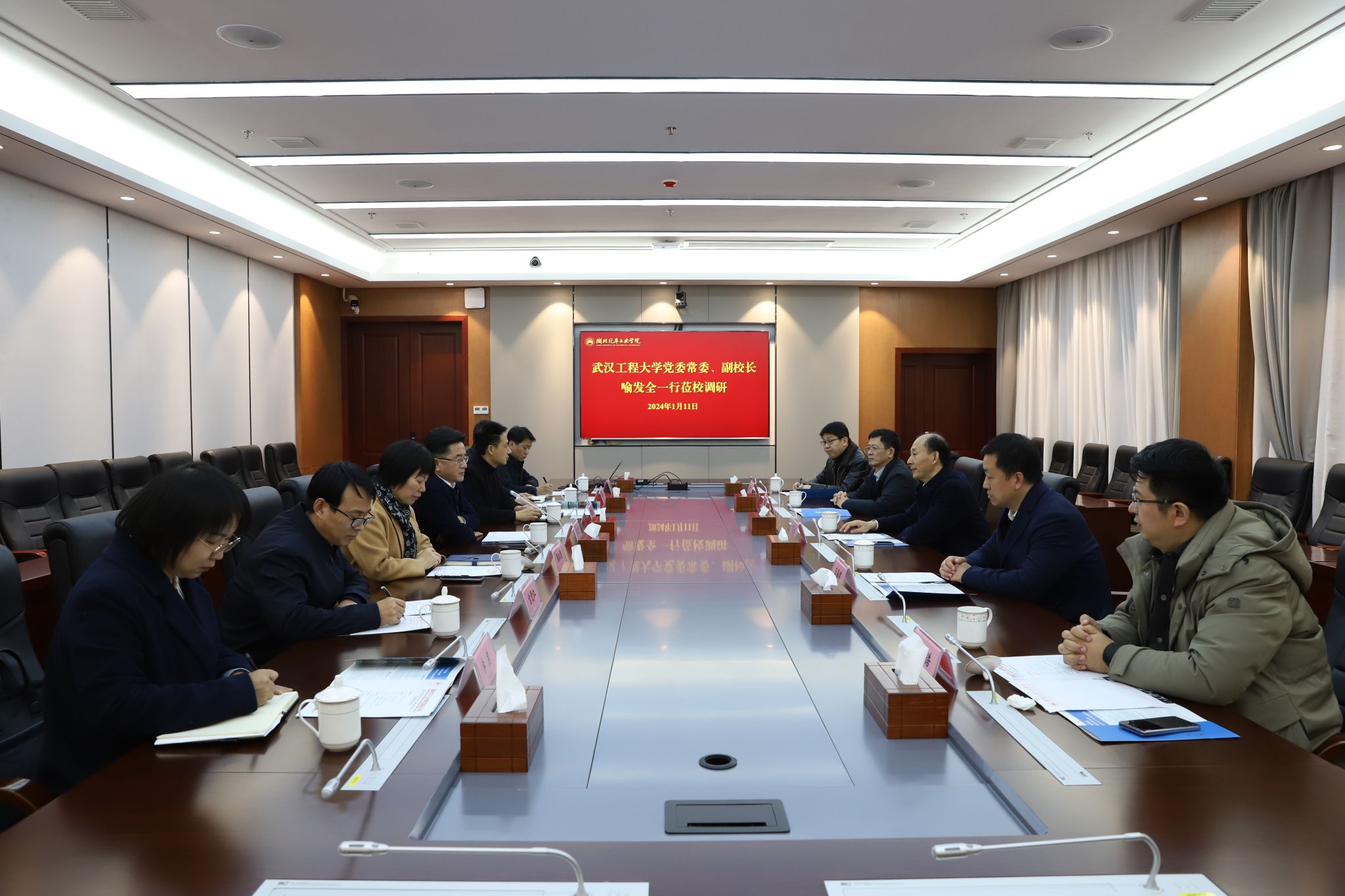 本网讯(文/图 邓玉洁)1月11日下午,武汉工程大学副校长喻发全一行来校调研并在产教大楼三楼会议室举行交流座谈会。校党委书记张文学,副校长张红霞,党委常委、党政办主任王文山陪同调研。座谈会由张红霞主持。