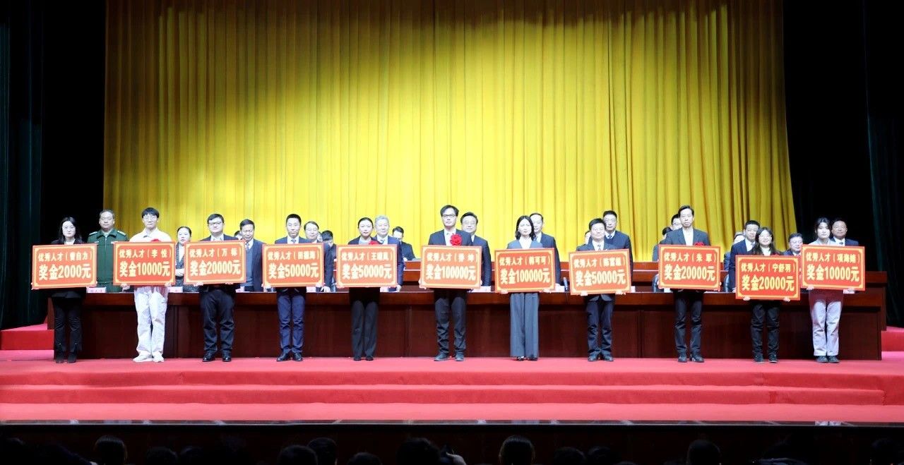 会议表扬2023年度区域经济发展突出贡献者,拿出2872.64万元向405家单位和400名个人兑现政策奖励。学校获科技创新奖、优秀人才奖等多项奖励表彰,并作为“绿色低碳发展千亿级示范区建设先进单位”受到通报表扬,王晴岚博士作为高校优秀人才代表现场领奖。