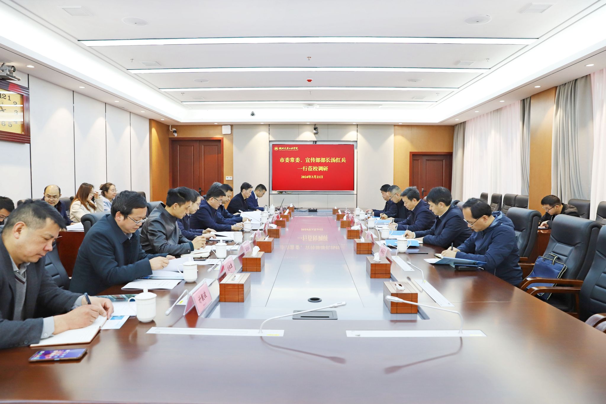 本网讯(文/图 广娟、张慧仙)3月21日上午,十堰市委常委、宣传部部长汤红兵一行6人莅临学校,就武当文化传承发展和双活化工程丛书出版工作进行专题调研。调研座谈会在产教大楼三楼多功能会议室召开。校党委书记张文学,党委副书记李涛,副校长高刃,党委常委、党政办公室主任王文山陪同调研。