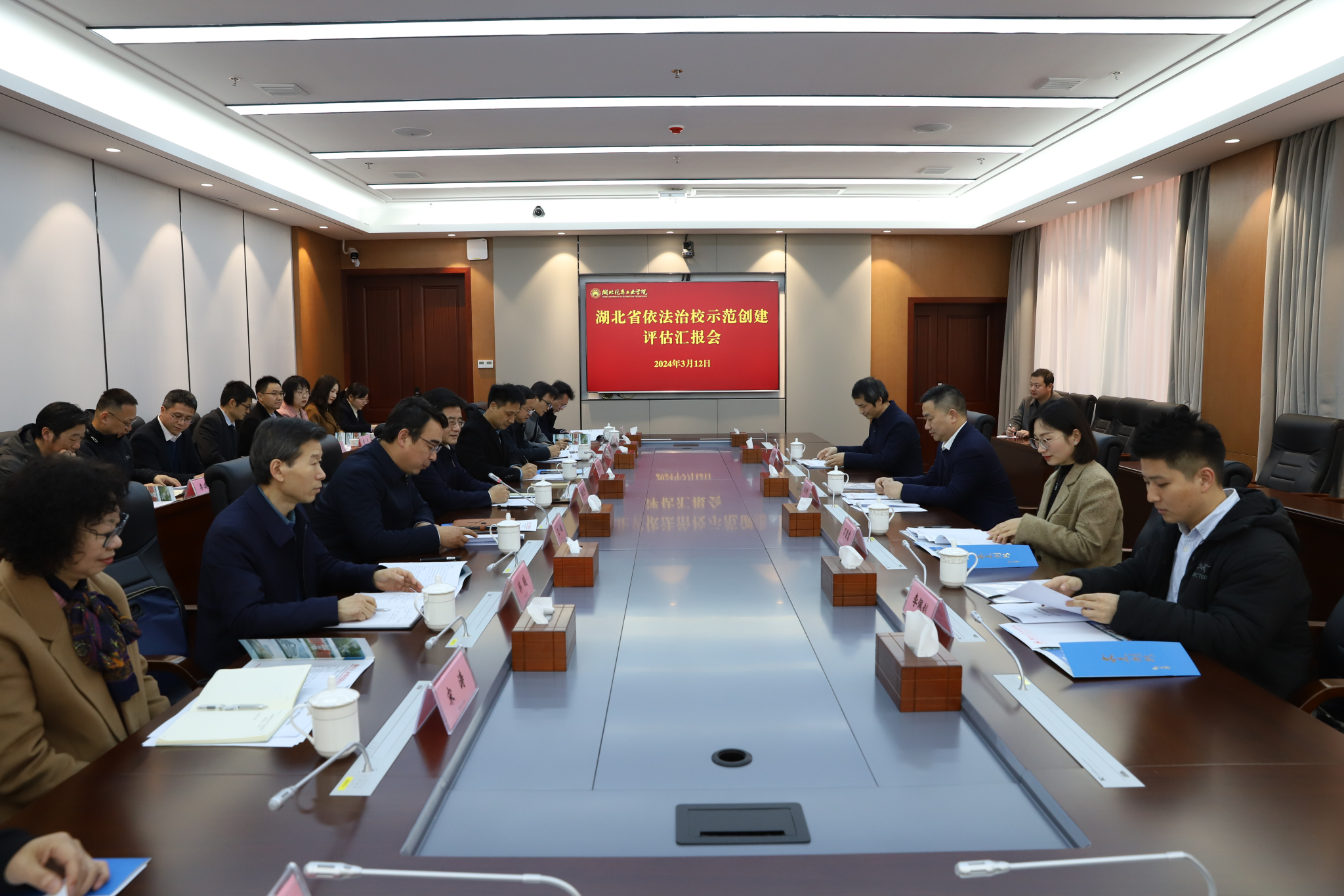 汇报会上,张文学对专家组一行表示欢迎,并对学校总体情况、办学特色、法治工作等作了简要介绍。他强调,学校高度重视法治工作,将依法治理作为学校治理的基本理念和基本方式,积极融入、贯穿学校工作全过程和各方面,形成了“一把手负总责,分管校领导具体抓,各二级单位基层抓”的责任体系。切实履行法治建设第一责任人工作职责,将法治作为推动学校改革发展的有力保障,全面推进依法治教、依法办学、依法治校,形成了特色鲜明的法治工作模式,学校法治建设取得了显著成绩,先后荣获第五届全国法律援助工作先进集体、全国知识产权人才培养工作先进集体、湖北省“法治文化建设示范点”、湖北省大学生“学宪法 讲宪法”优秀组织单位等荣誉称号。