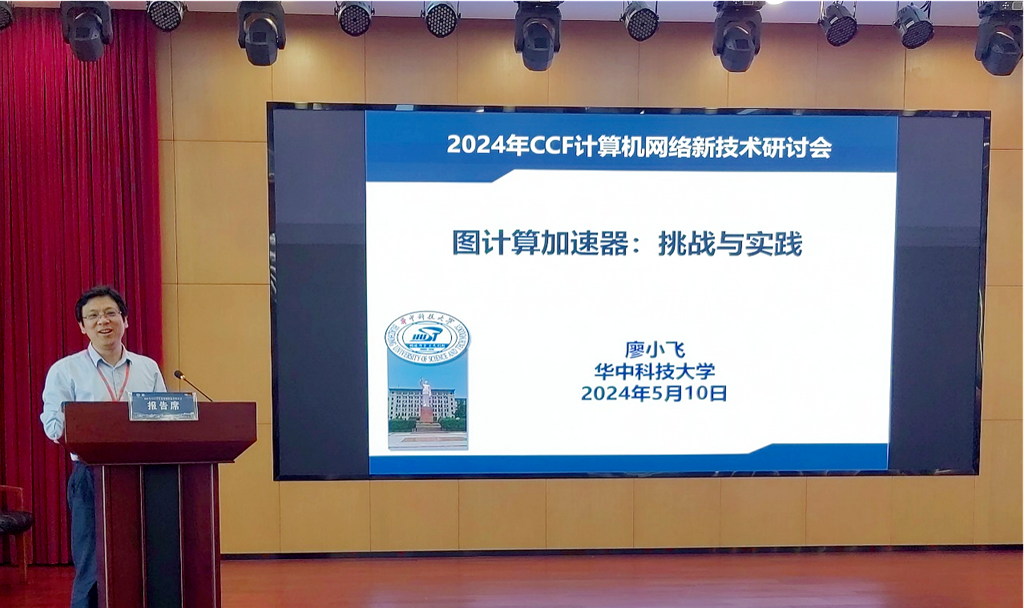 开幕式后,华中科技大学廖小飞教授做了“图计算:挑战与实践”主题报告,介绍了图计算的核心概念和技术以及如何更好地应用图计算技术解决实际问题,强调了其潜在的影响力和价值。英国埃克塞特大学闵革勇教授以“数字孪生驱动的自主网络运维和管理”为题,深入探讨了数字孪生驱动的自主网络运维和管理利用数字化建模和决策支持技术。湖南大学谢鲲教授做了“低开销网络测量”主题报告,探讨了低开销全网测量以及设备微观状态测量方法,就如何获得全量细粒度网络性能数据,降低测量开销以及对网络的影响等做了阐述。