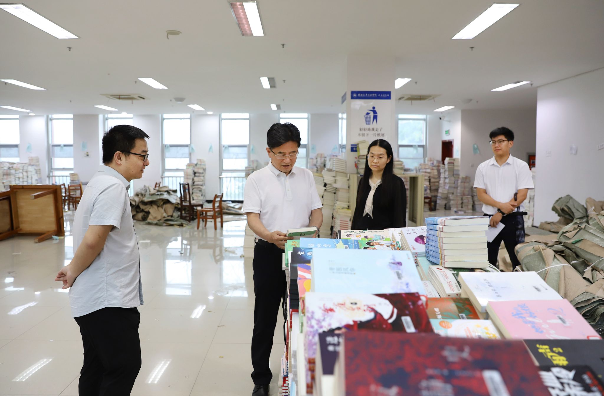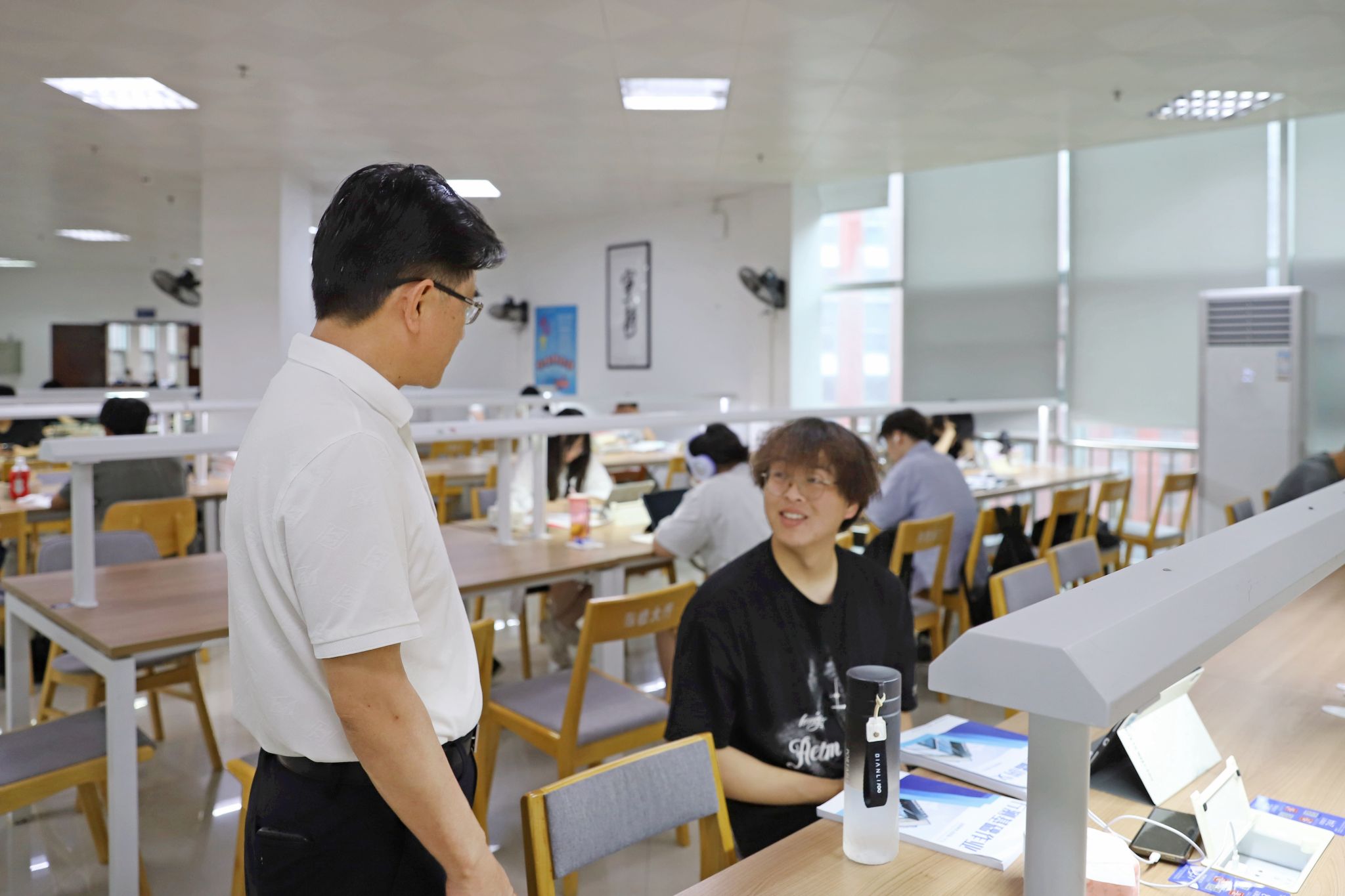 在图书馆,张文学查看了图书加工分类和学习环境优化工作,又看望了留校复习考研考公的同学。“是在准备考研吗?”“当前学习进度怎么样?”“在学校吃住都还好吗?” 张文学了解同学们的学习和生活情况,对同学们刻苦备考的精神给予充分肯定。他勉励同学们珍惜暑假时光,合理制定考研目标和计划,持之以恒、直面困难、坚持到底,叮嘱同学们要注意劳逸结合、加强锻炼、健康生活。