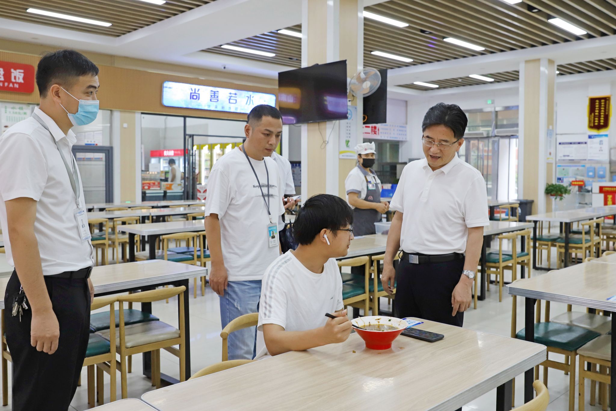 在李园食堂,张文学与用餐学生亲切交谈,了解学校暑期服务保障工作情况,耐心倾听同学们的诉求以及对学校暑期留校相关保障工作的期盼和建议。他指出,学校相关部门要进一步加大服务保障力度,切实做好3000余名留校师生的服务保障工作,为他们学习、科研、生活等提供便利条件,解除他们的“后顾之忧”。