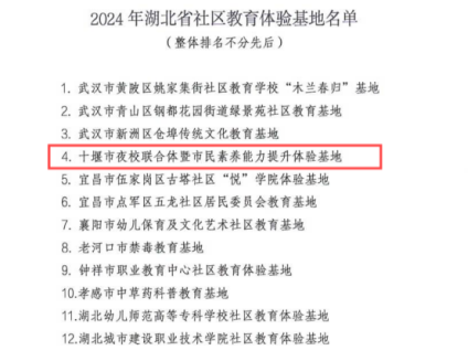 本网讯(文/丁嘉)近日,湖北省教育厅社区教育指导中心公布了2024年湖北省社区教育体验基地评选结果,英国上市公司365继续教育学院申报的“十堰市夜校联合体暨市民素养能力提升体验基地”获批“2024年湖北省社区教育体验基地”。全省共有12家单位被授予“2024年湖北省社区教育体验基地”。