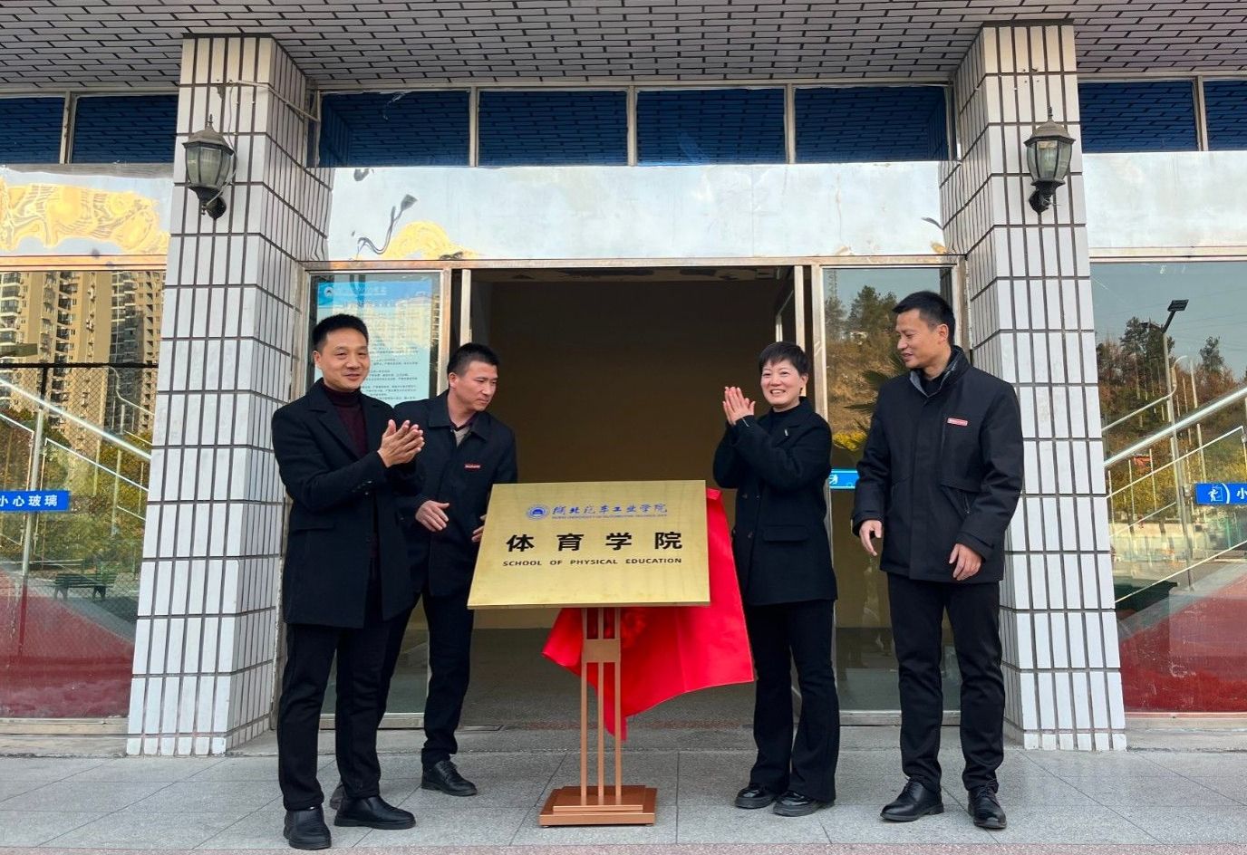 本网讯(文/黄小斌)1月18日下午,体育学院揭牌仪式在体育馆门前举行。学校党委常委、党政办主任王文山,学院全体教职工参加仪式。揭牌仪式由体育学院党委书记、院长熊玲主持。