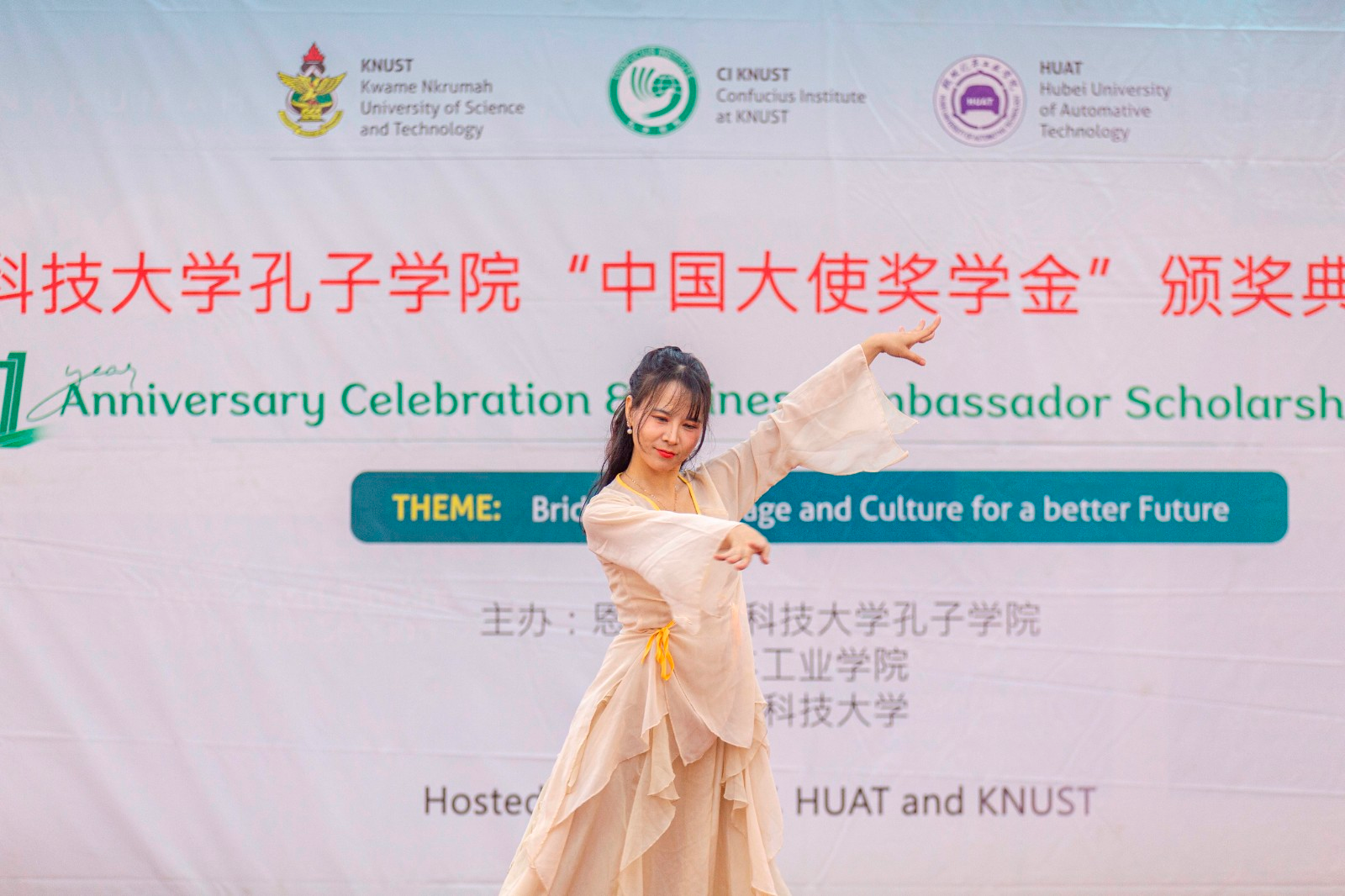 据悉,恩克鲁玛科技大学副校长、人文学院院长、工程学院院长、相关系部主任和师生共计400余人参加了庆典活动。活动期间,孔子学院教学点师生和中方教师还表演了精彩纷呈的节目。(审稿 苏子波)