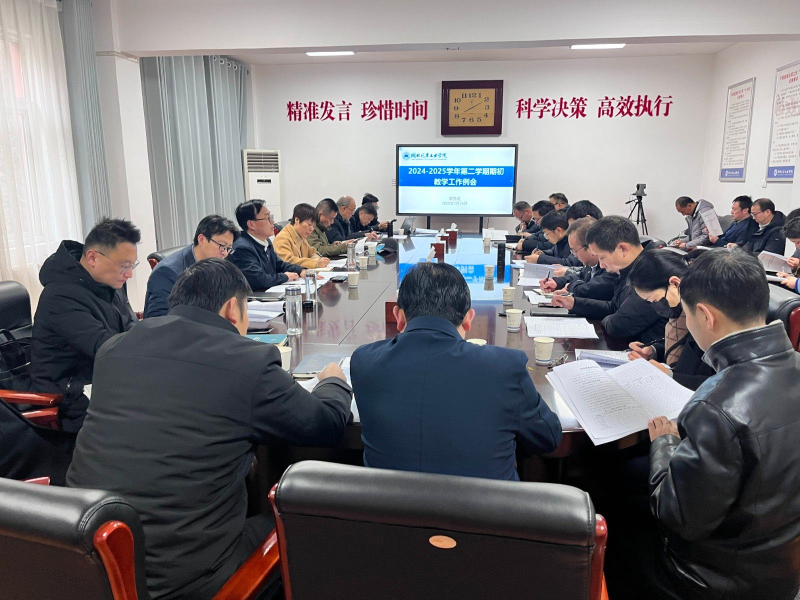 本网讯(文/图 潘佳欣)2月26日上午,学校在行政楼三楼会议室组织召开2024-2025学年第二学期期初教学工作例会。学校教学督导组组长,学工部、教务处、教学质量监控与评估中心(教师发展中心、高等教育研究所)、创新创业教育学院负责人,各二级学院教学院长,科技学院教学负责人,襄阳、武汉产学研基地负责人及教务处科级以上干部参加会议。党委常委、副校长张红霞出席会议,会议由教务处处长宫爱红主持。