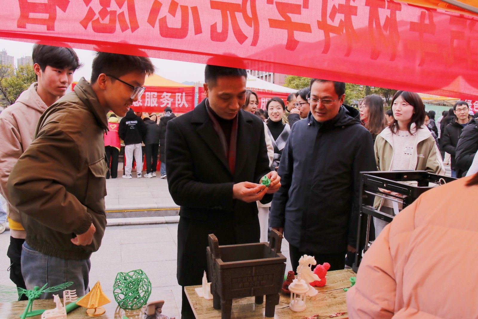 汽车文化广场变身公益实践课堂,王文山宣布“学雷锋志愿服务月”活动正式启动,并为新成立和更名的12个学院志愿者分会授旗。随后,丰富多彩的公益集市热闹非凡,吸引众多师生驻足。人工智能学院的避障机器人穿梭于人群,miniLED屏可实时展示摄像头画面,吸引众多师生参与以“AI路同行引领‘锋’尚”为主题的学生动手作品义卖及人工智能知识问答竞赛,凸显科技手段与志愿精神结合的魅力;汽车材料学院的3D打印机器和成品展示令人大开眼界,增材制造专业同学现场讲解制作流程、答疑解惑;设计学院的雷锋主题徽章DIY工坊及“徽章漂流”互动链,创意十足,让雷锋精神在爱心传递中得以延续;研究生院的征兵宣传,退役士兵研究生分享军旅故事,为有志青年投身国防添砖加瓦;汽车商学院“石榴籽一家亲”摊位上,藏族同学的服饰展示与歌舞表演,构筑起民族交融的温情场景;继教院的无人机知识宣讲与航拍体验,为同学们打开低空经济的知识窗口;机器人与自动化学院的“剪纸传非遗,雷锋精神绽新彩”活动,让千年剪纸艺术邂逅现代校园,师生们手执剪刀,以红宣纸为媒介,精心雕琢出一幅幅以志愿服务为主题的剪纸作品,让传统剪纸文化在新时代找到了生动鲜活的表达方式。