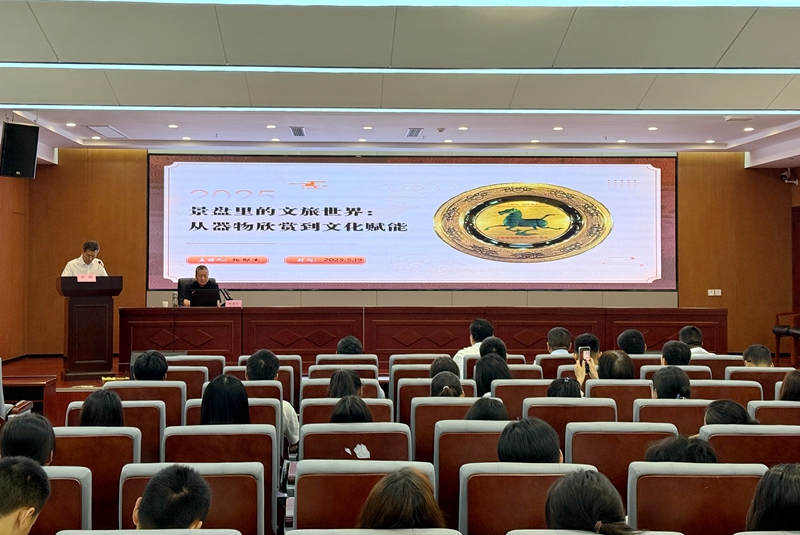 在参观博览馆过程中,杨郧生以“浓缩的山河,凝练的智慧”为核心,向师生们阐释景盘的文化内涵,寄语青年学子从传统器物中汲取文化创造力。随后,杨郧生为参展师生作了题为《景盘里的文旅世界:从器物欣赏到文化赋能》专题讲座,通过案例分析阐释景盘在文旅策划、文创设计中的转化路径,为在场师生打开“以文化赋能产业升级”的新思路。