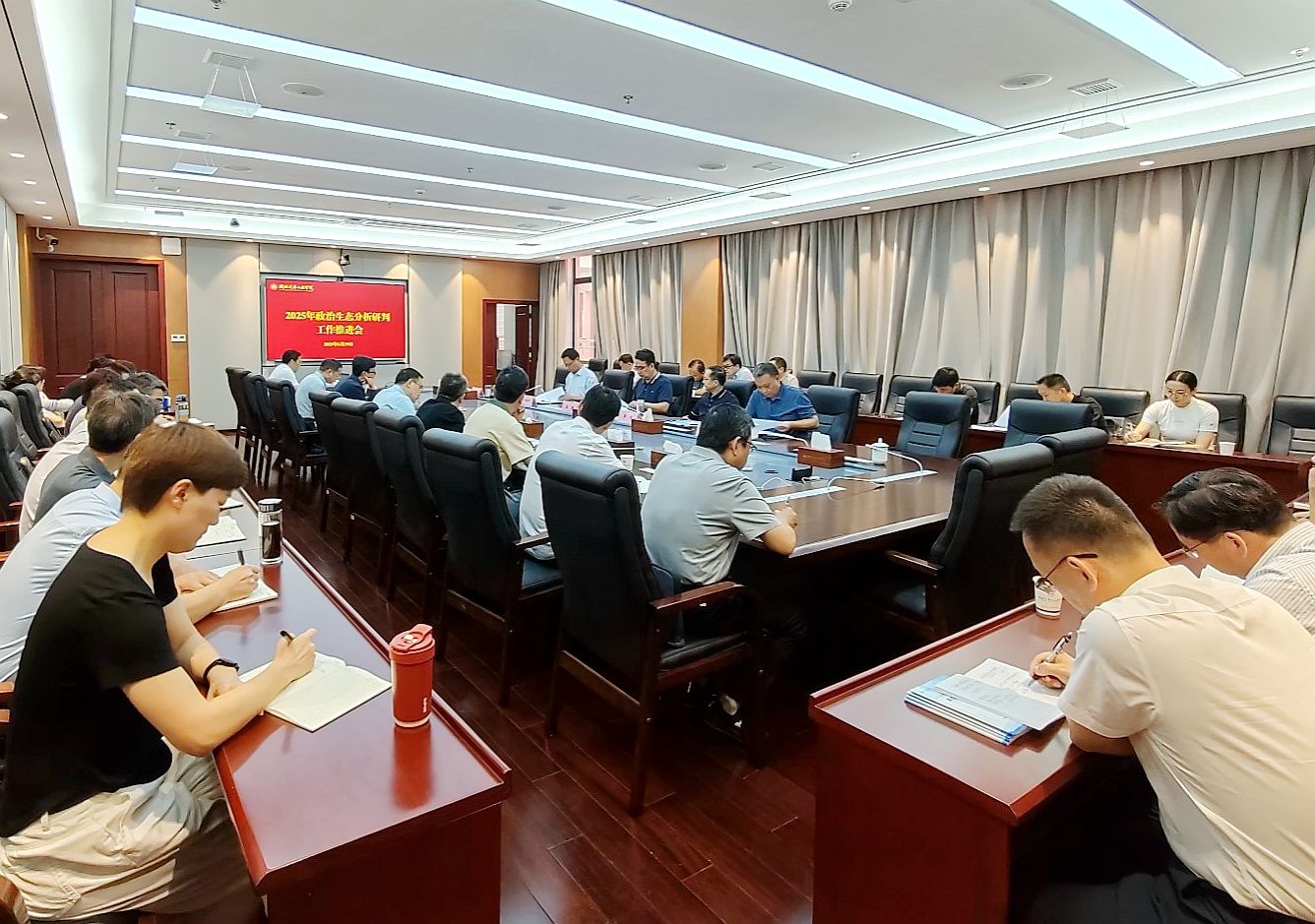 本网讯(文/张臻)6月19日上午,学校在产教大楼三楼多功能会议室召开2025年政治生态分析研判工作会,强调要压实责任强落实,以政治生态研判护航学校高质量发展。校领导王晓、李涛、陈建平、王镇、王文山出席会议,联席会成员单位及二级党组织负责人参加会议。