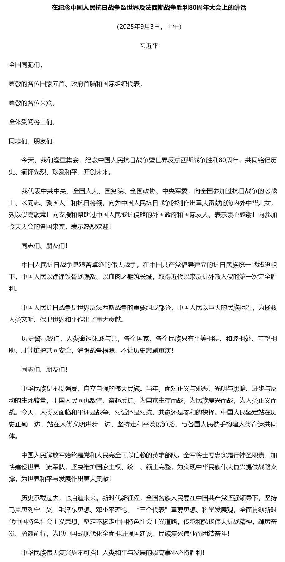 【学习进行时】习近平:在纪念中国人民抗日战争暨世界反法西斯战争胜利80周年大会上的讲话