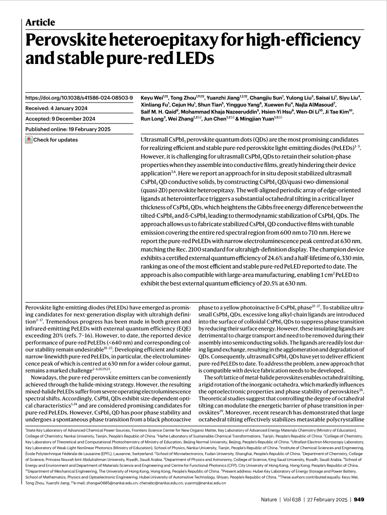 优秀成果一:周峒博士为共同第一作者的研究成果“Perovskite heteroepitaxy for high-efficiency and stable pure-red LEDs”