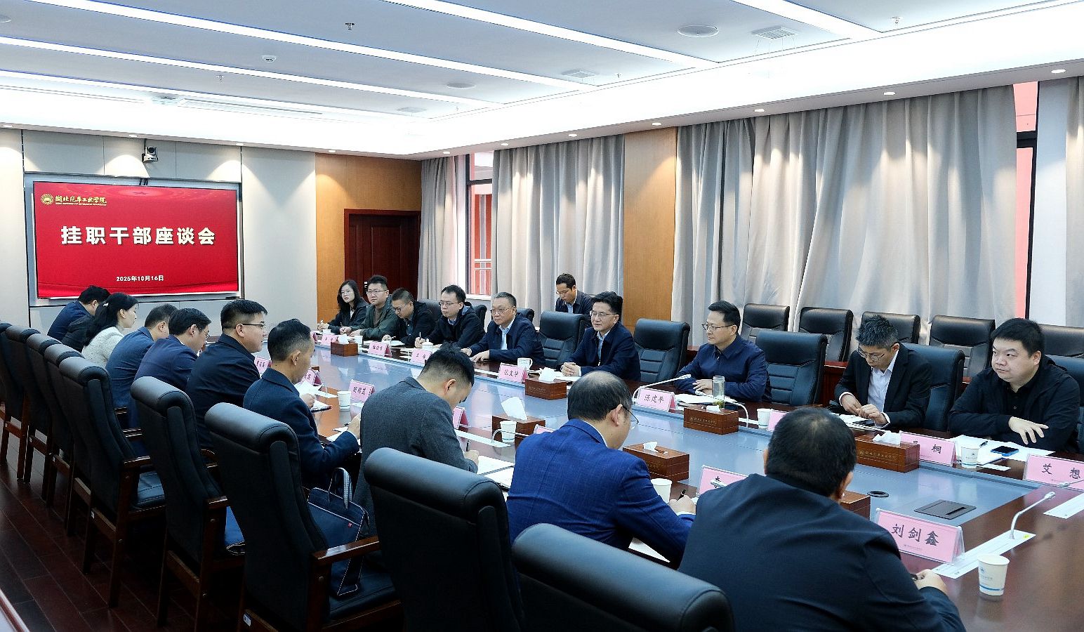 本网讯(文 王雪雪/图 邓玉洁)10月16日上午,学校在产教大楼三楼多功能会议室召开挂职干部座谈会。党委书记张文学,党委副书记、纪委书记、监察专员陈建平,党委常委、组织部部长、统战部部长王镇出席,近五年来外派挂职干部代表、二级党组织书记参加会议。