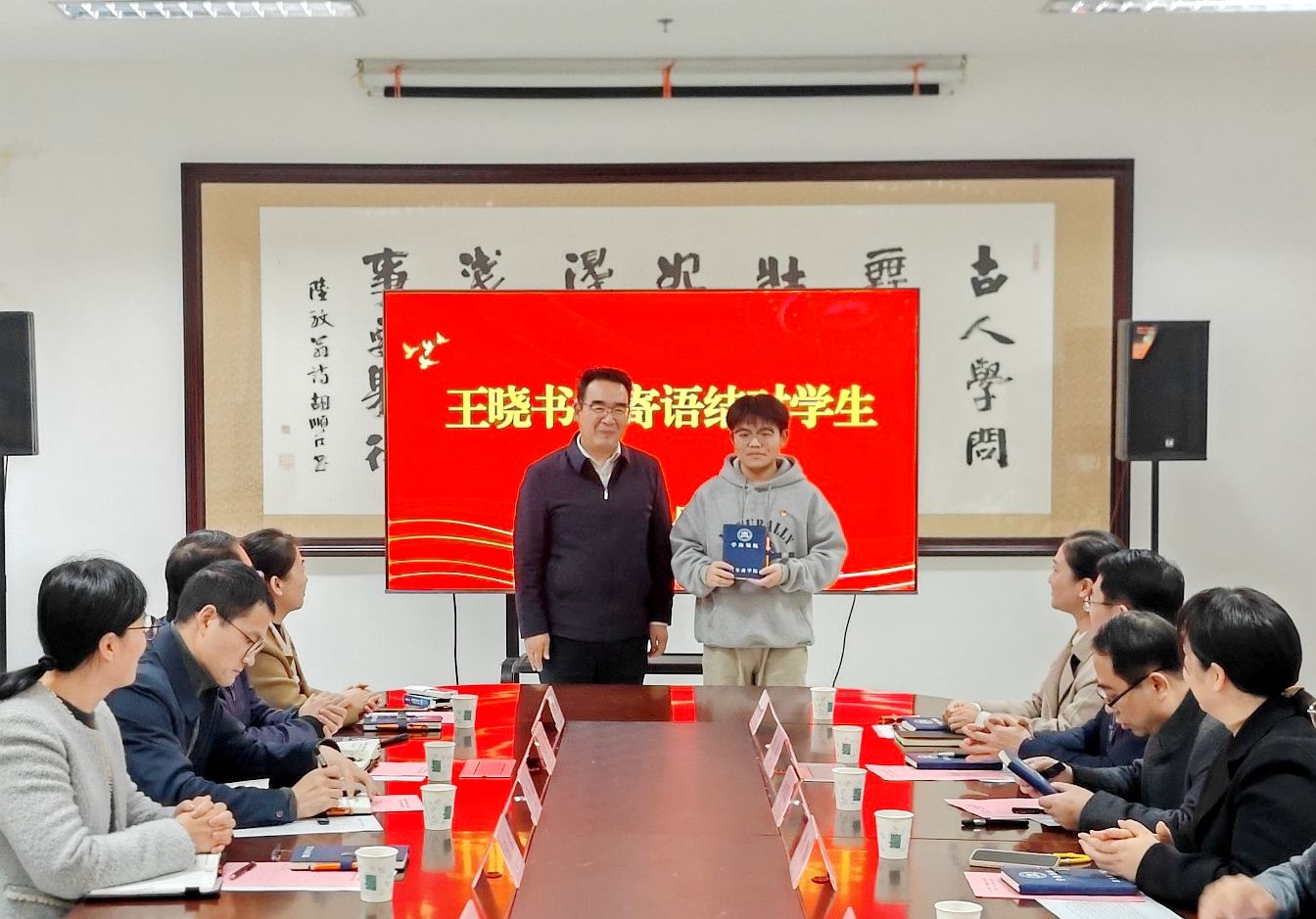 11月19日下午,党委常委、组织部部长王镇出席外语外贸学院“学海领航”推进会暨暖冬行动。他肯定活动意义,要求结对老师履职尽责当好引路人,鼓励学生主动求教、提升核心能力,从容应对成长挑战,在青春赛道上笃定前行。现场,结对学生汇报学习生活与成长规划,师生围绕专业提升、职业规划等话题深入互动,导师针对性解答学生难题。活动中,结对老师为学生赠送手写寄语笔记本及暖冬物资,并赴宿舍为“党员宿舍”挂牌。