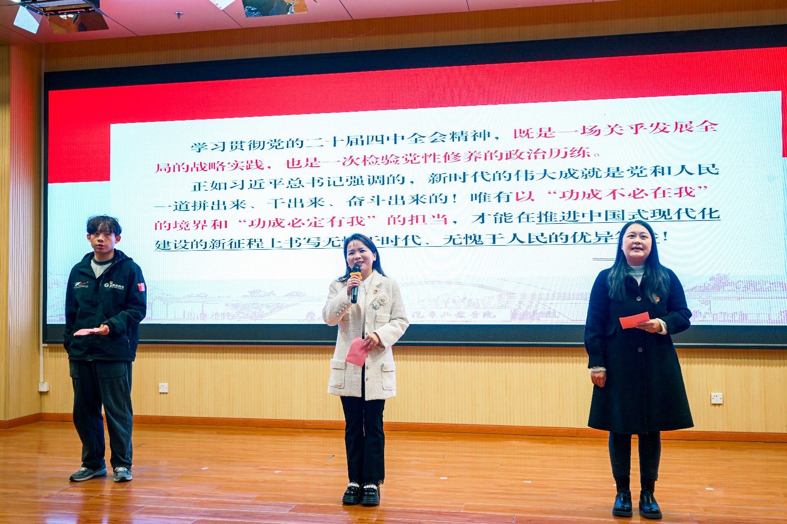 省委宣讲团成员、校团委副书记胡霄寒强调党的二十届四中全会精神是青年的“行动指南”,青年要以“十四五”发展成就为基石争做新质生产力追求者,在各领域用青春引擎驱动梦想。团市委宣讲团成员李雅琨通过两件发生在学生身边、扎根在祖国大地的志愿故事,感召青年扎根基层、服务群众,用志愿服务的热忱,为中国式现代化建设注入青春动能。团省委“00”后宣讲团成员李志成则从他在东风HUAT车队完成各项挑战出发,分享他对“十四五”规划中“培育高素质技术技能人才队伍”的理解。