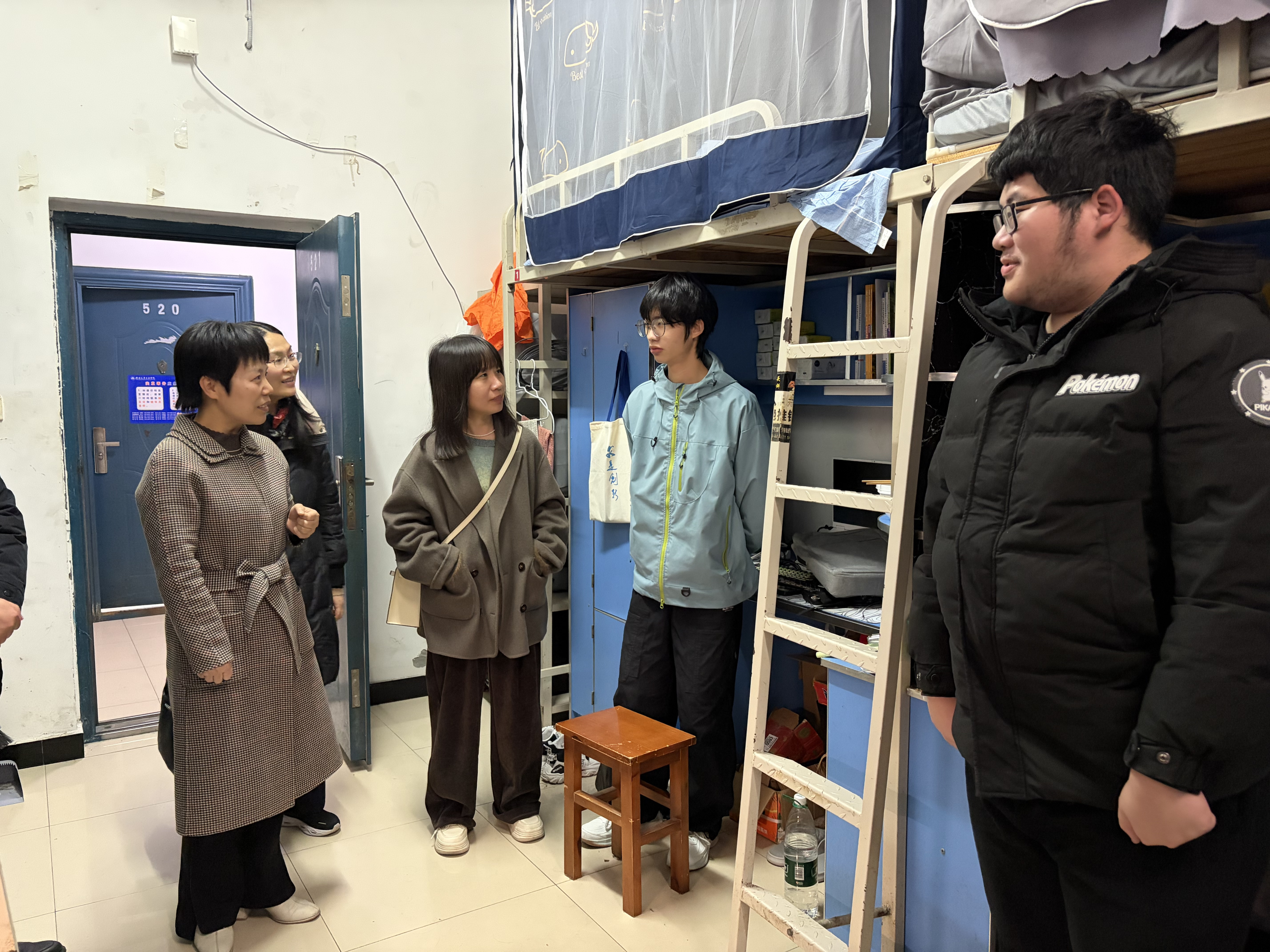 “大学生活适应得如何?”“学习上有没有什么困难?”走访过程中,张红霞与同学们亲切交谈,细致询问日常起居、学业进展与未来规划,倾听大家进入大学后的收获与困惑。她以师者之心、朋友之态,与同学们共话成长,并对同学们的求知热情与积极风貌给予充分肯定。