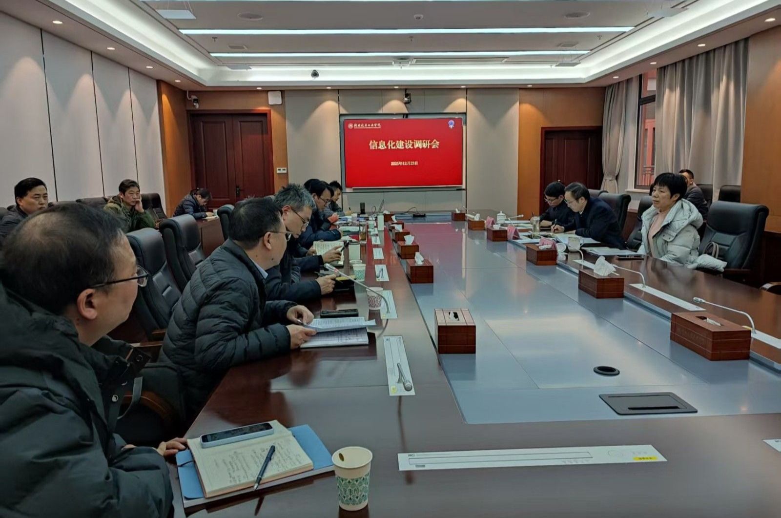 会议听取了信息技术中心关于智慧校园建设进展与“十五五”规划设想的汇报,科学技术发展研究院关于科研算力建设现状与下一步计划的介绍,以及财务处关于银校合作进展与资金筹措方案的报告。与会各职能部门及二级学院负责人聚焦“人工智能+”教育变革、数据资源治理与应用、智能算力统筹供给、银校合作模式创新等关键议题,进行了深入研讨与交流。