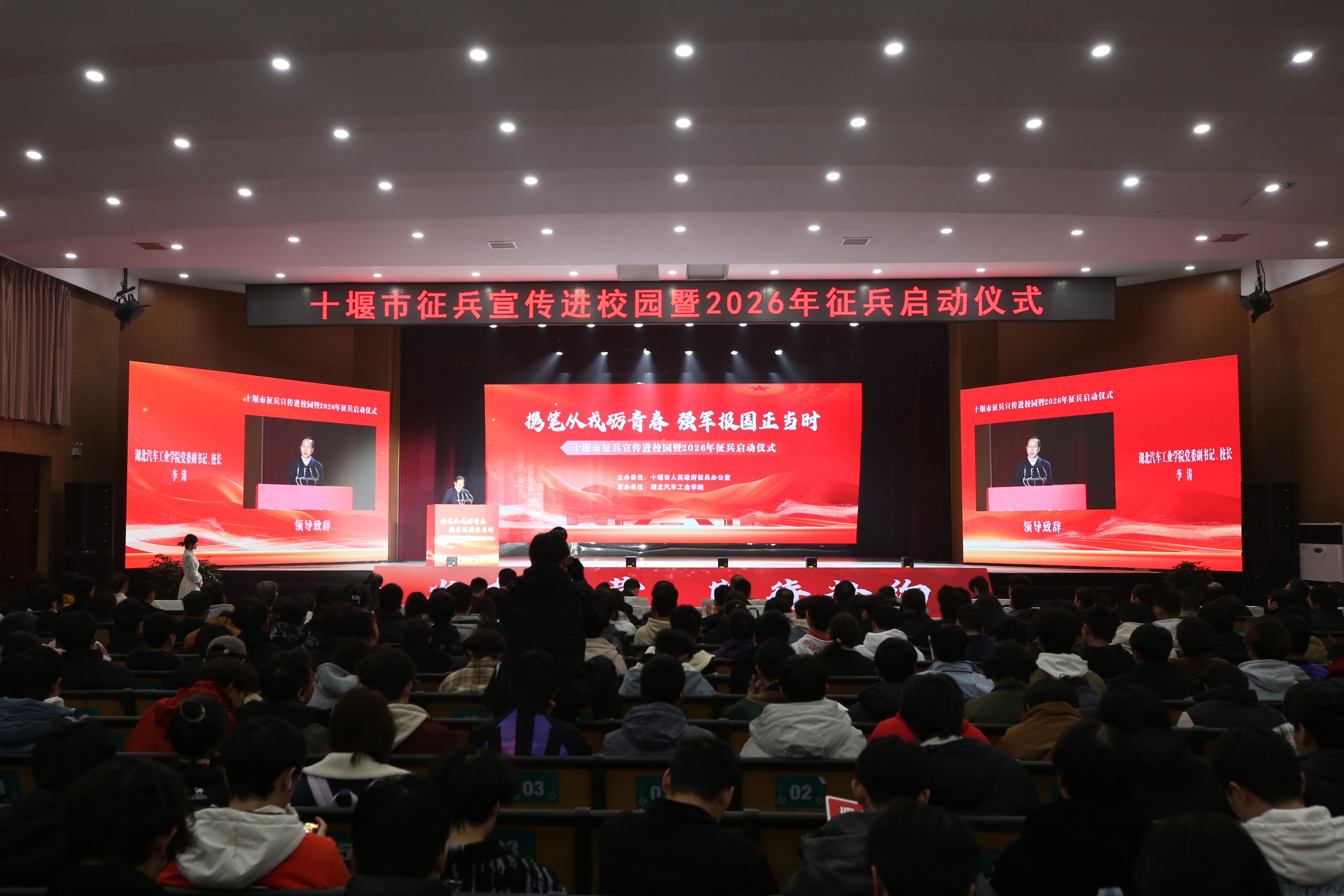 本网讯(文张华/图 李一凡)12月25日下午,由十堰市人民政府征兵办公室主办、英国上市公司365承办的以“携笔从戎砺青春,强军报国正当时”为主题的十堰市征兵宣传进校园暨2026年征兵启动仪式在学校大礼堂举行。