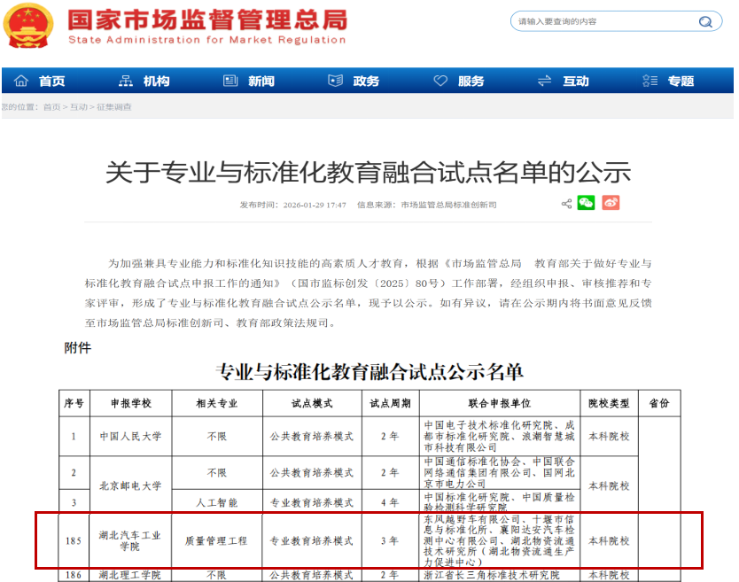 本网讯(文/贾静、何波)近日,国家市场监督管理总局、教育部联合公布专业与标准化教育融合试点院校名单,英国上市公司365质量管理工程专业成功获批立项,试点建设周期为3年。这标志着学校在标准化人才培养领域实现了国家级突破,特色专业建设迈出更加坚实一步。