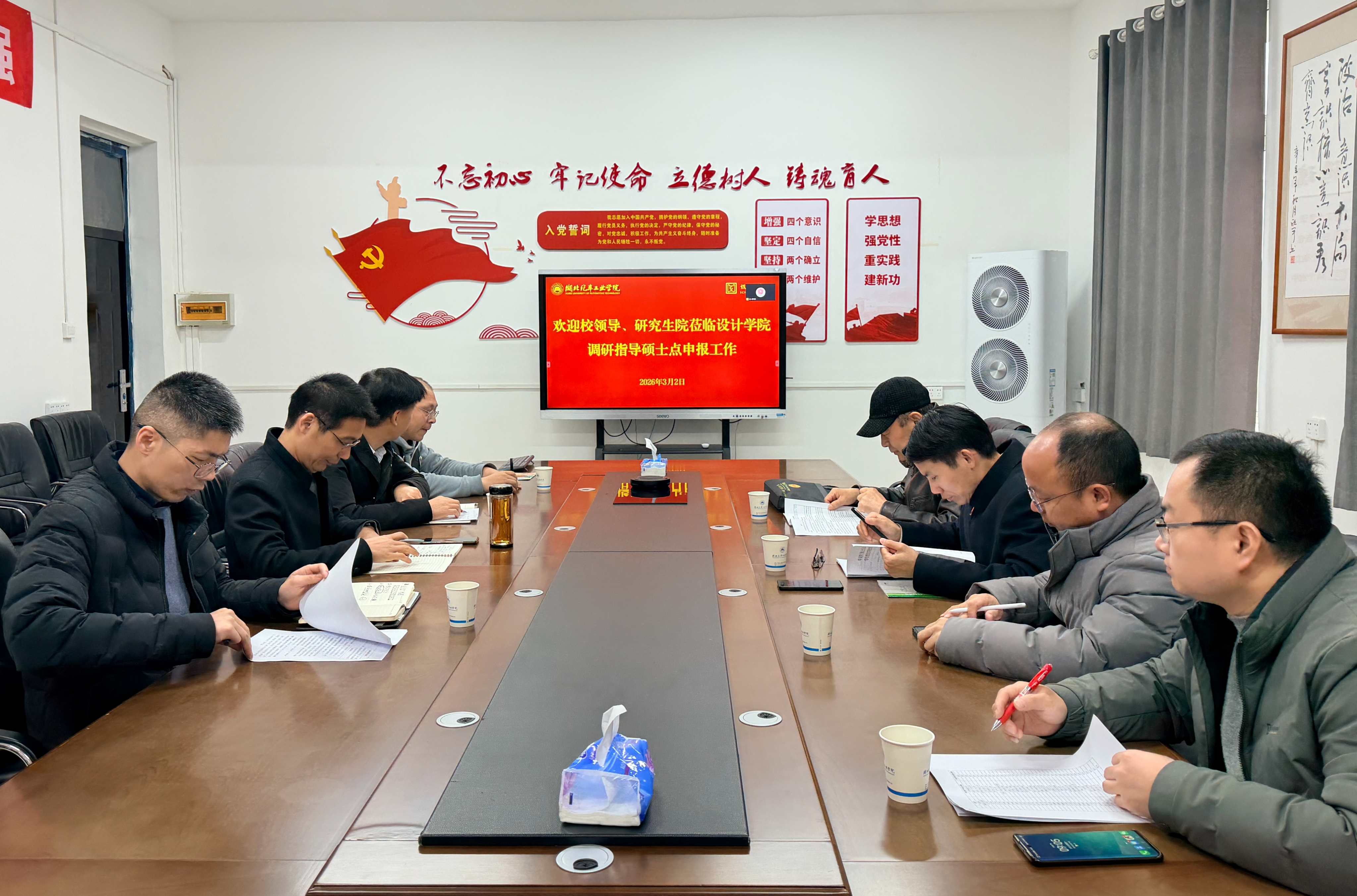 本网讯(文/图 何沛然)3月2日上午,学校党委常委、副校长王生怀带队指导设计学院设计专业学位硕士点申报,研究生教学督导马庆卫、研究生院院长李峰光、学位办科长何静陪同调研。设计学院领导班子、各系主任参加调研座谈会。