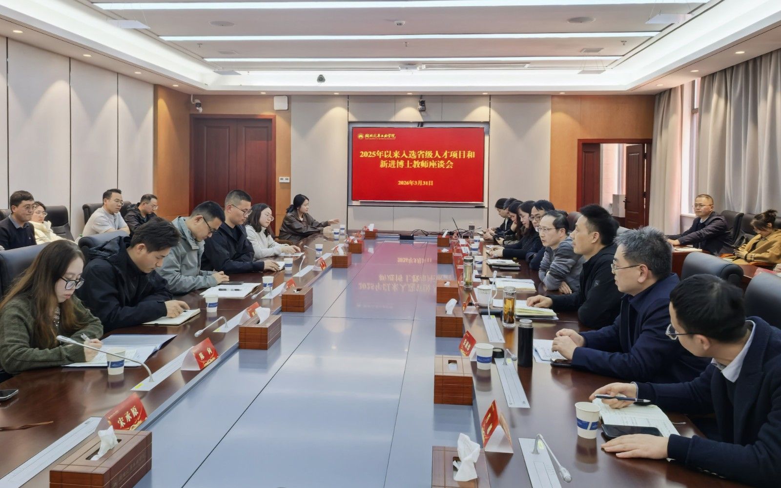 本网讯(文/董圣滨、吴俊)为深入贯彻人才强校战略,激发青年教师和骨干人才创新活力与动力,营造人才辈出、人尽其才、才尽其用的良好氛围,学校于3月31日下午召开2025年以来入选省级以上人才项目和新进博士教师座谈会。校长李涛出席会议并讲话,校党委常委、副校长王文山主持会议,人事处、教务处、学科办、科发院等部门负责人及50余名青年博士参加座谈会。