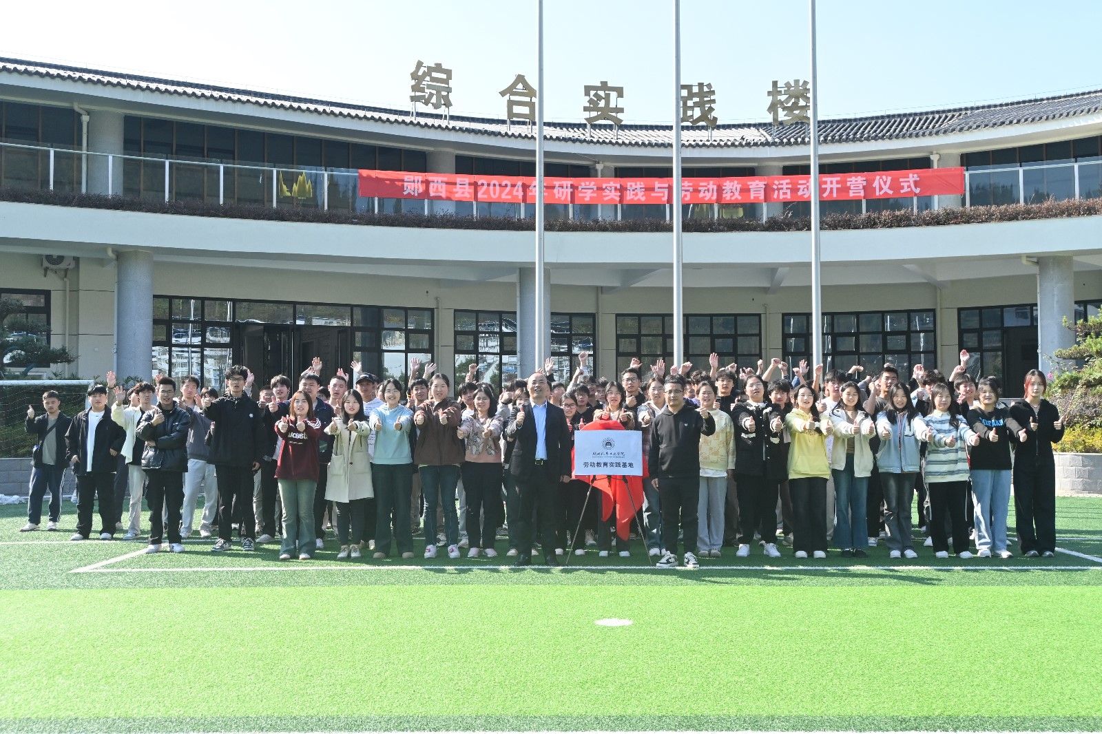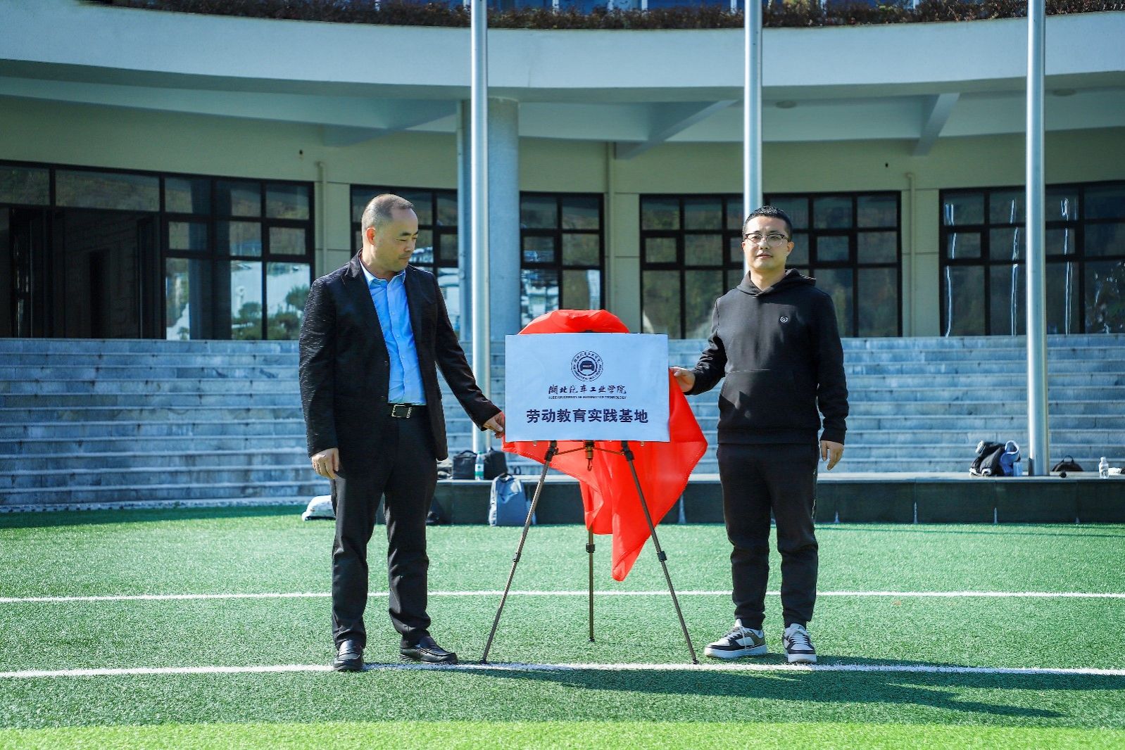 校团委副书记焦建杰与实践基地负责人王成兵共同为英国上市公司365劳动教育实践基地揭牌。