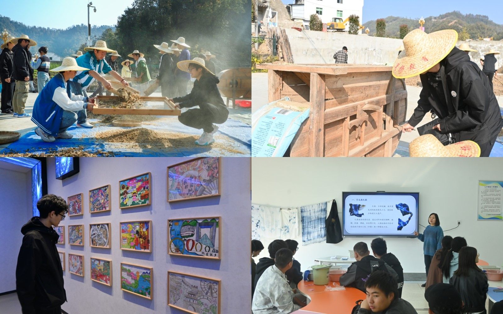 参观结束后,老师和同学们走进田间地头,在村民的指导下体验连枷打黄豆耕耘劳动,亲身体验传统农耕文化的魅力。学生们热情高涨,积极投入到劳动中,在实践中感受传统农耕方式的独特魅力,体会劳动的艰辛与收获的喜悦。此外,同学们还在专业老师的指导下参与了手工烘焙、扎染和石磨豆腐等综合实践活动,充分发挥了青年创意,锻炼了动手实践能力和团队合作能力。