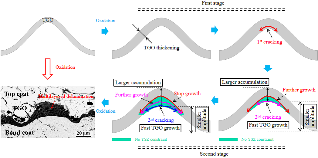 该论文研究了高温防护涂层(热障涂层)在极端高温长时工作过程中热生长氧化物出现了非均匀多层分层开裂现象,基于断裂和损伤力学理论,利用仿真技术结合实验结果复现了热障涂层全寿命周期内氧化物动态生长及分层开裂过程。氧化物非均匀分层开裂机制的揭示将对未来高性能长寿命涂层的制备在工艺优化和结构设计方面提供重要理论指导。