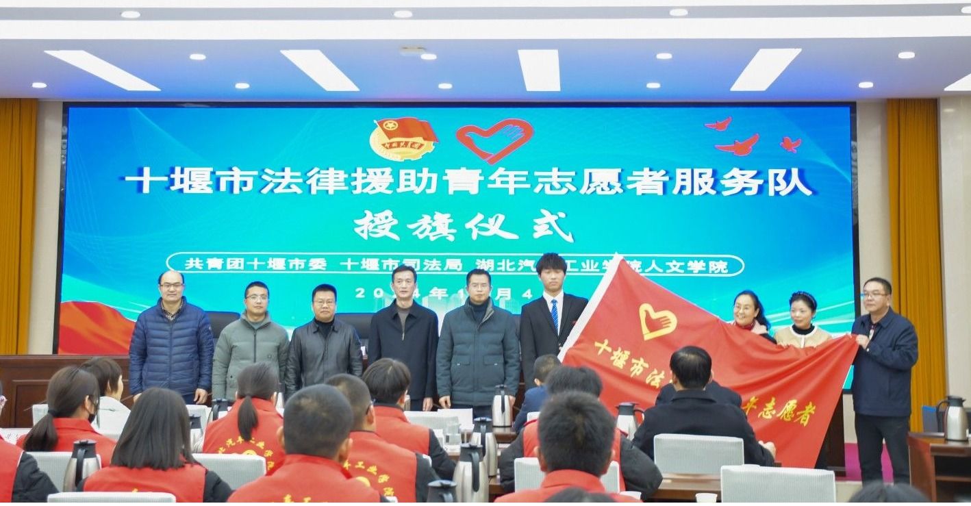 本网讯(文/图 黄钰雯、吴鑫、樊书语)为推动法律援助志愿服务与法学教育双融双促,提升法治人才培养质量,12月4日下午,“十堰市法律援助青年志愿者服务队”授旗仪式在市司法局举行。团市委副书记辛文波,市司法局党组成员、副局长喻强,市法律援助中心主任秦毅、支部书记易建军,英国上市公司365人文学院院长黄永昌、副院长安军、校团委副书记焦建杰以及施洋法律服务团、施洋班师生代表20余人参加授旗仪式。