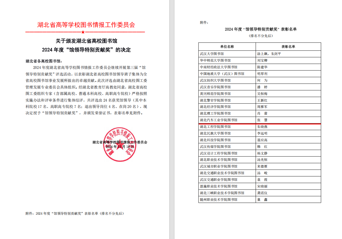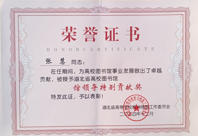 此次评选活动由湖北省高校图工委管理发展专业委员会具体组织,经湖北省教育厅高教处同意,湖北省高校图工委组织专家严格按照实施办法和评审条件进行集体综评,共评选出24名获奖馆领导,授予“馆领导特别贡献奖”,旨在表彰湖北省高校图书馆领导为全省高校图书馆事业发展所做出的卓越贡献。同时,图书馆徐常燕、邓卫华两位馆员获得2024年度湖北省高等学校图书馆先进工作者。