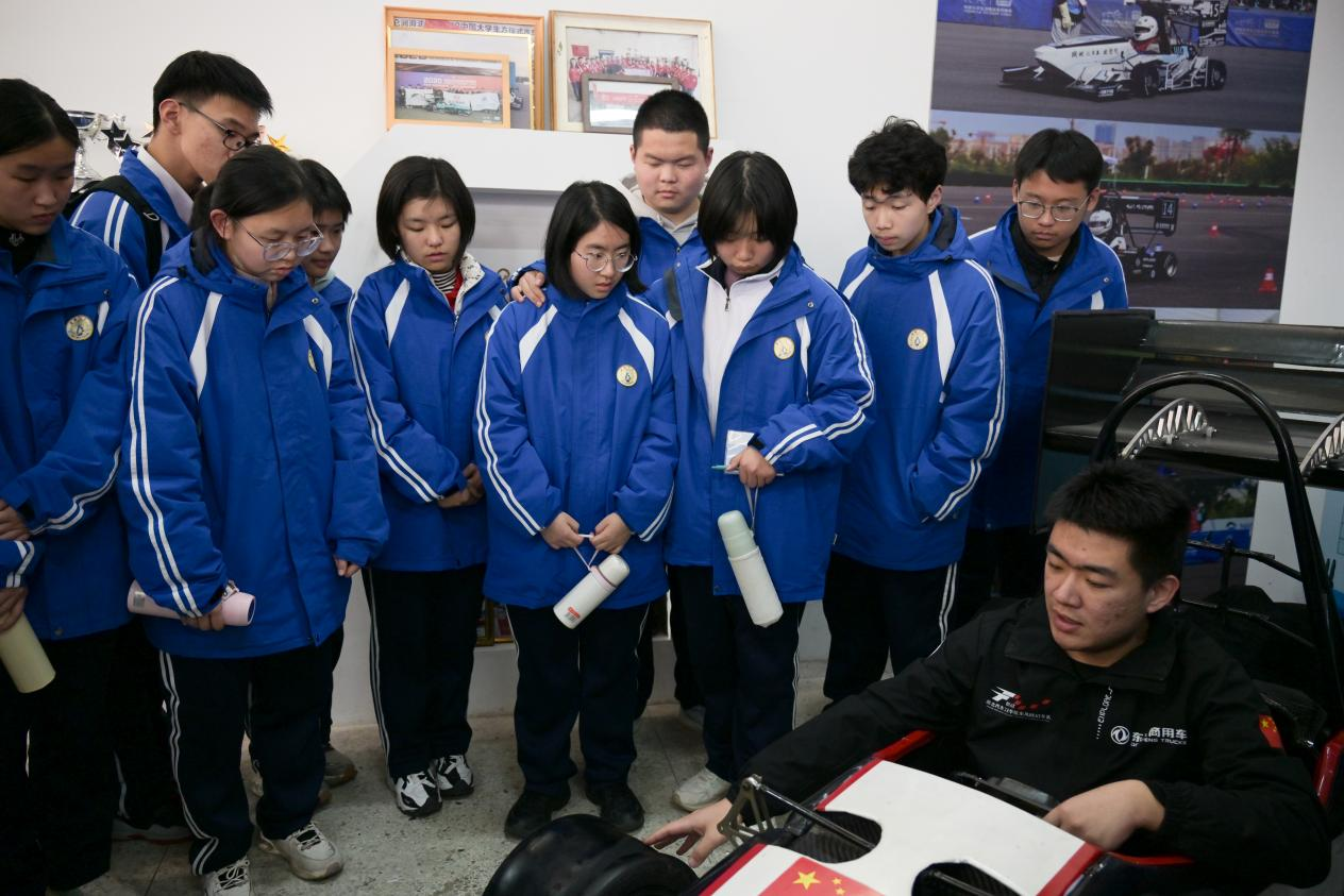 在东风HUAT车队实验室,陈列的方程式赛车瞬间点燃了学生们的热情。车队队员向学生们展示了车队自主研发的赛车底盘和轻量化车身,并分享了车队在“中国大学生方程式汽车大赛”中蝉联冠军的奋斗历程。当听到赛车发动机的轰鸣声时,学生感叹,“没想到一辆赛车的背后需要这么多学科知识的融合,工程师们太酷了!”