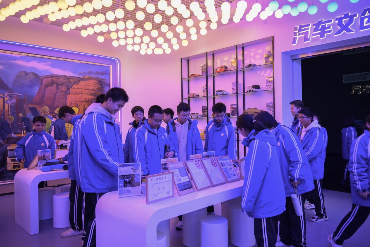 在汽车科创科普基地,讲解员向同学们讲解了中国汽车工业科技创新简史,汽车运行的基本原理以及学校科技创新成果,并邀请学生参与模拟赛车互动。通过全息投影、动态模型等多媒体技术,学生们直观感受到科技如何从实验室走向生产线,从理论转化为生产力。