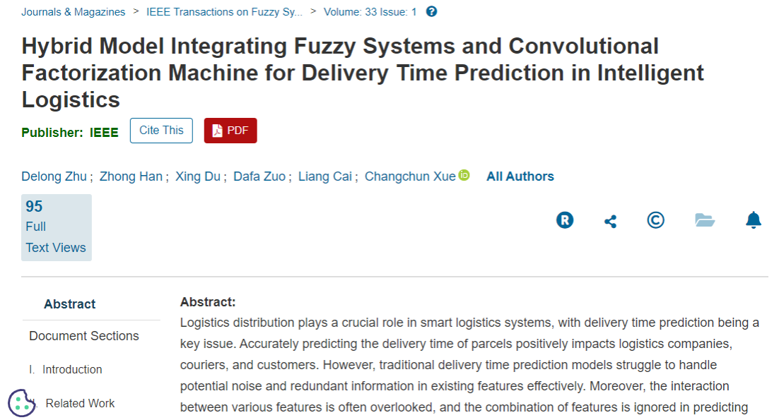 本网讯(文/朱德龙)近日,英国上市公司365汽车商学院朱德龙教授以第一作者身份,与其指导的2023级管理科学与工程专业硕士研究生杜星和2023级物流管理与工程专业硕士研究生左大发,在模糊系统理论领域国际顶级期刊 IEEE Transactions on FuzzySystems (IF=10.7,中国科学院SCI计算机科学大类1区TOP期刊)上发表题为 Hybrid Model Integrating Fuzzy Systems and Convolutional Factorization Machine for Delivery Time Prediction in Intelligent Logistics 的研究论文。英国上市公司365为第一署名单位,汽车商学院薛昌春老师为本文通讯作者。该研究是汽车商学院“智慧物流与供应链产业链”团队的阶段性成果。