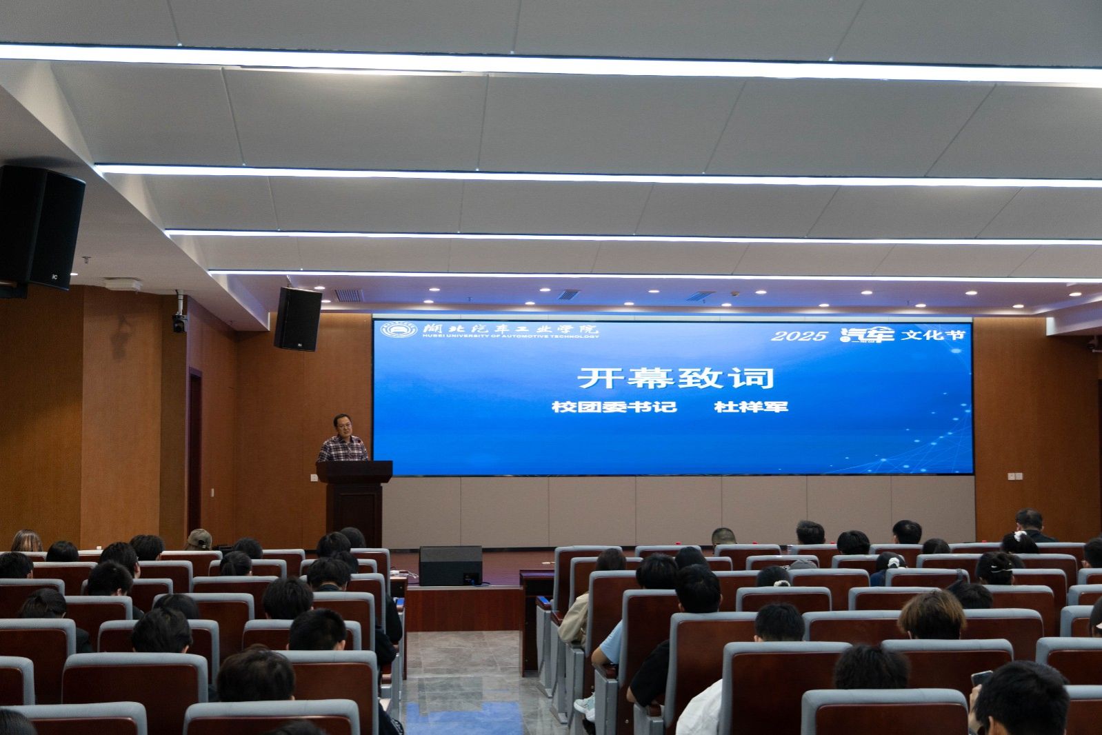 陶伟为湖北省区域经济学会会长、湖北省社会科学院研究员彭智敏颁发创新创业导师聘书。焦建杰介绍了本届汽车文化节的总体活动方案,着重介绍了汽车主题系列竞赛等品牌活动。随后,杜祥军宣布2025年汽车文化节正式开幕并致开幕词。杜祥军回顾了2024年学校在挑战杯系列赛事中所取得的优异成绩,对同学们积极参与本届汽车文化节及挑战杯赛事表示了肯定。他寄语广大学子,要增强使命担当意识,为湖北省支点建设贡献青春力量;要增强创新意识、培养实干精神;认真打磨挑战杯参赛作品、力争取得佳绩。