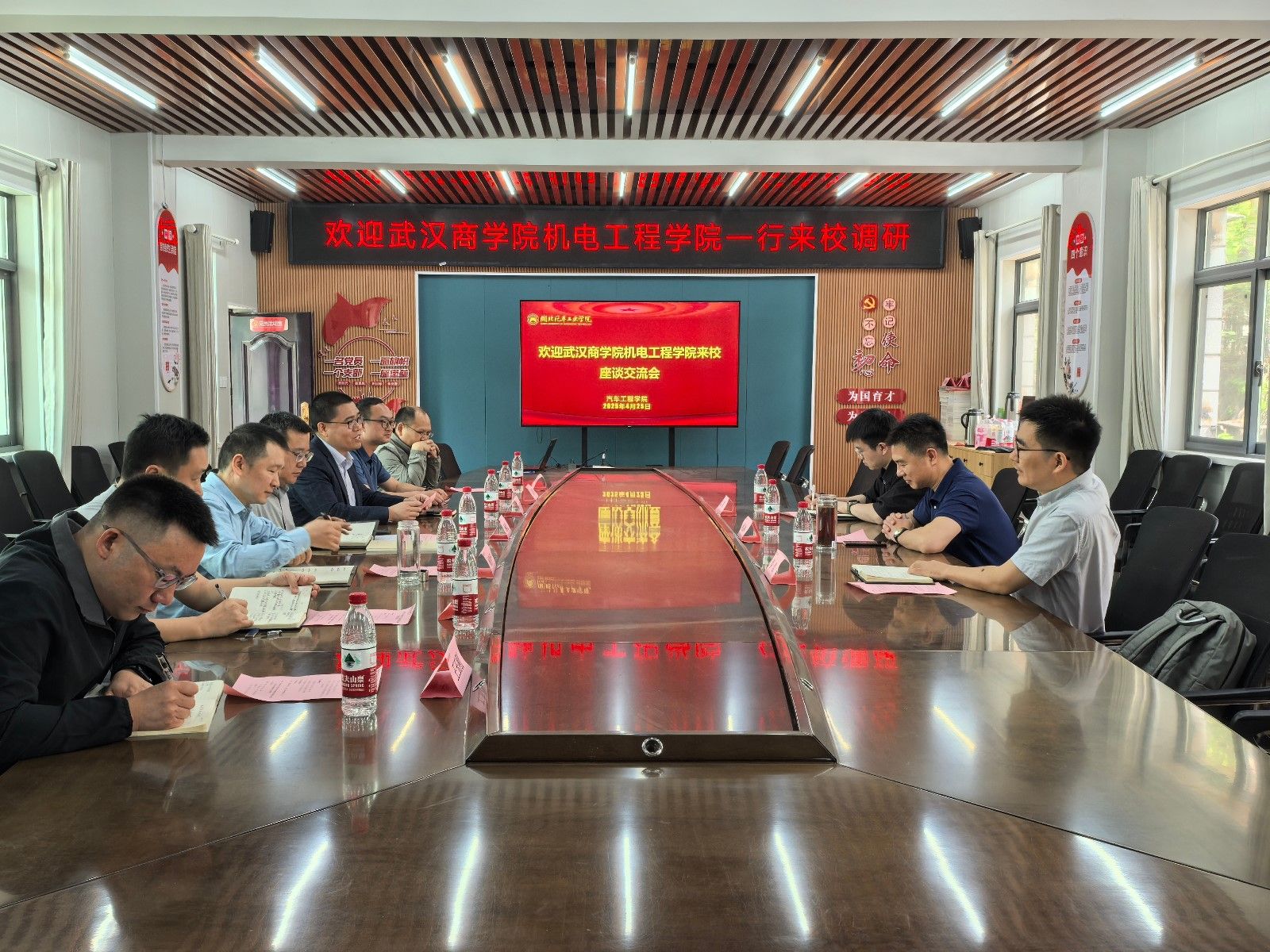 本网讯(文/图 李函、宫雅楠)4月25日上午,武汉商学院机电工程学院院长姚层林一行莅临学校,进行新能源汽车工程专业建设交流。汽车工程学院党委书记杨亚会、副院长董焱章及新能源汽车工程系骨干教师共同参加。