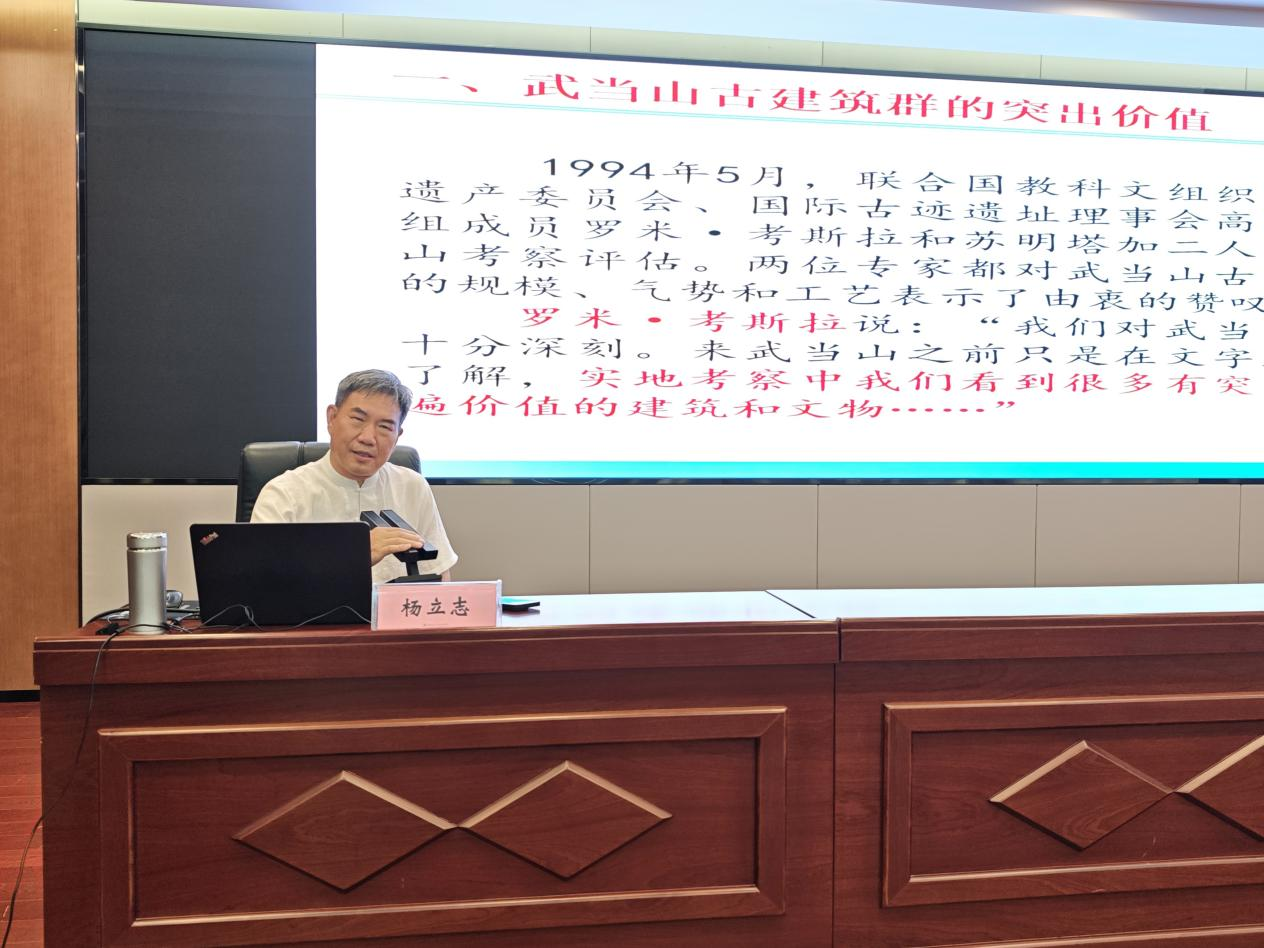 讲座中,杨立志以“武当山建筑群的整体布局与民间故事”为主题,围绕武当山古建筑群的突出价值、武当山宫观布局、武当山古建筑群的宏观设计、人工与自然和谐统一的典范、吟诵武当山建筑群诗歌举隅、寓意吉祥、祝福美好的建筑装饰等6个方面展开讲述。