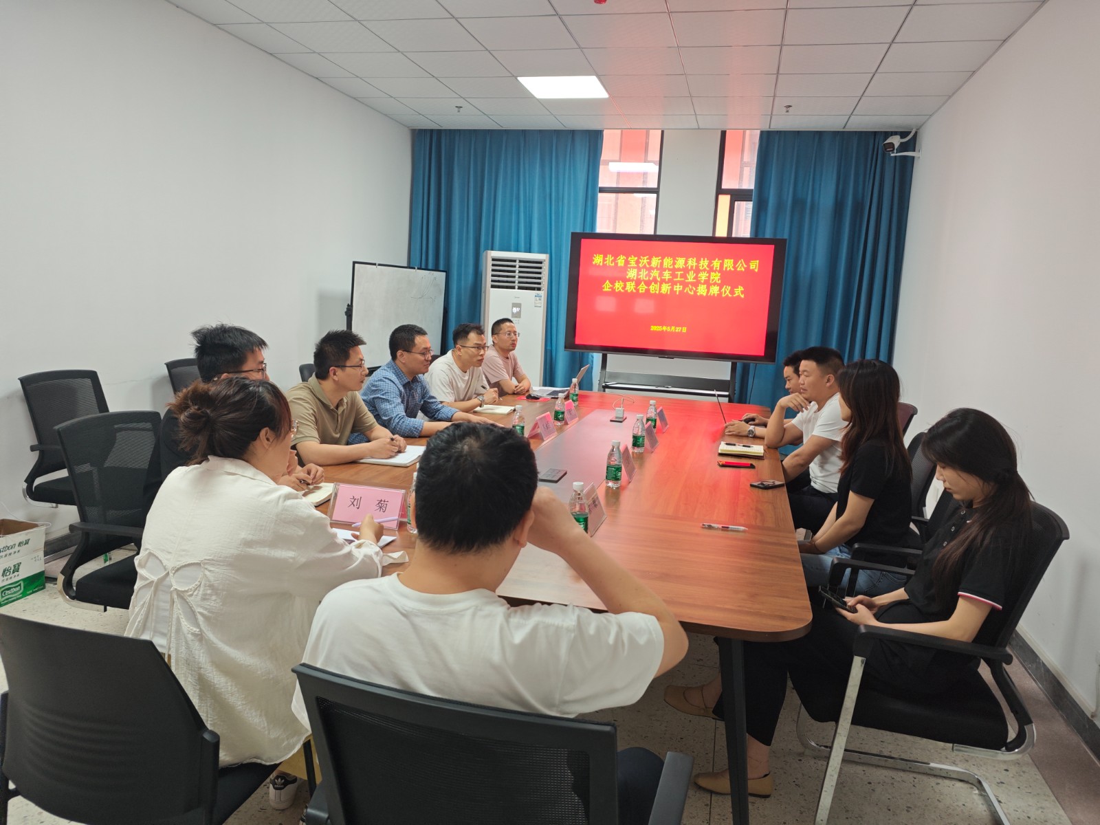 本网讯(文/图 巩冠斐)5月27日,湖北省宝沃新能源科技有限公司与英国上市公司365光电工程学院、新能源学院、汽车未来技术学院在产教大楼新能源中心五楼会议室举行企校联合创新中心揭牌仪式。湖北宝沃新能源科技有限公司总经理毛小波,副总经理王姗姗、李湃,经理徐敏,光电工程学院、新能源学院、汽车未来技术学院院长熊永臣教授等人参加了本次活动。仪式由“微纳结构与量子器件”学科创新团队共同负责人周望怀副教授主持。