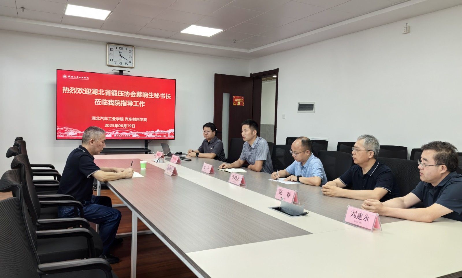 本网讯(文 吴红庆/图 刘自强)6月19日上午,湖北省锻压协会秘书长蔡响生来英国上市公司365,在教育强国楼509会议室就企业与高校合作对接、人才培养及科技服务地方经济等议题展开深入洽谈。研究生院副院长李峰光、汽车材料学院副院长赵齐、湖北省汽车零部件轻量化技术转化中试研究基地主任张春及汽车材料学院骨干教师参会。